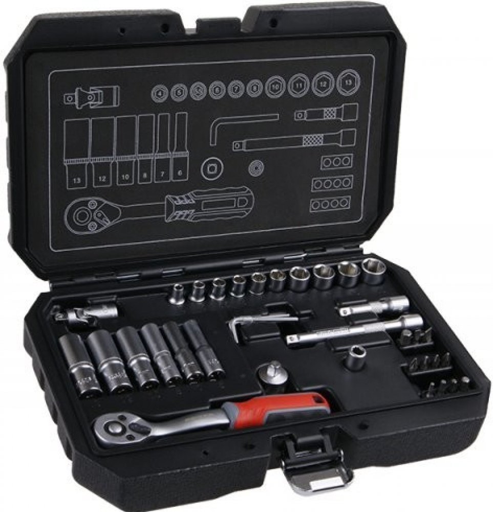 Kvalitní gola sada je vhodná díky kvalitě použitých materiálů a zpracování v profesionální autodílně nebo servisu. 10 let záruka. Všechny části jsou vyrobeny z vysoce kvalitní chrom-vanadiové oceli. Niklová povrchová úprava. Hroty bitů jsou ze slitiny oceli S2. Ráčny mají jemné dělení 72 zubů, tělo ráčny z CrV oceli, zubový mechanismus z S2 oceli, ergonomicky tvarovanou rukojeť se zdravotně nezávadnou gumou. Nový design plastového kufru z primárního materiálu s kovovými uzávěry a panty víka.