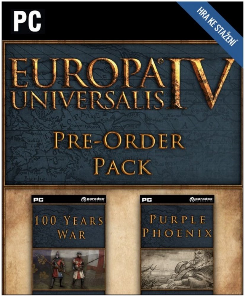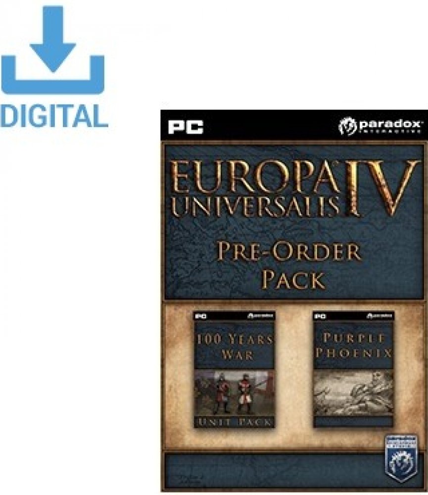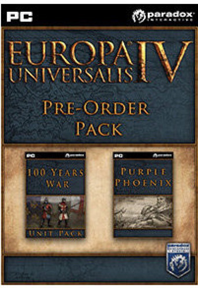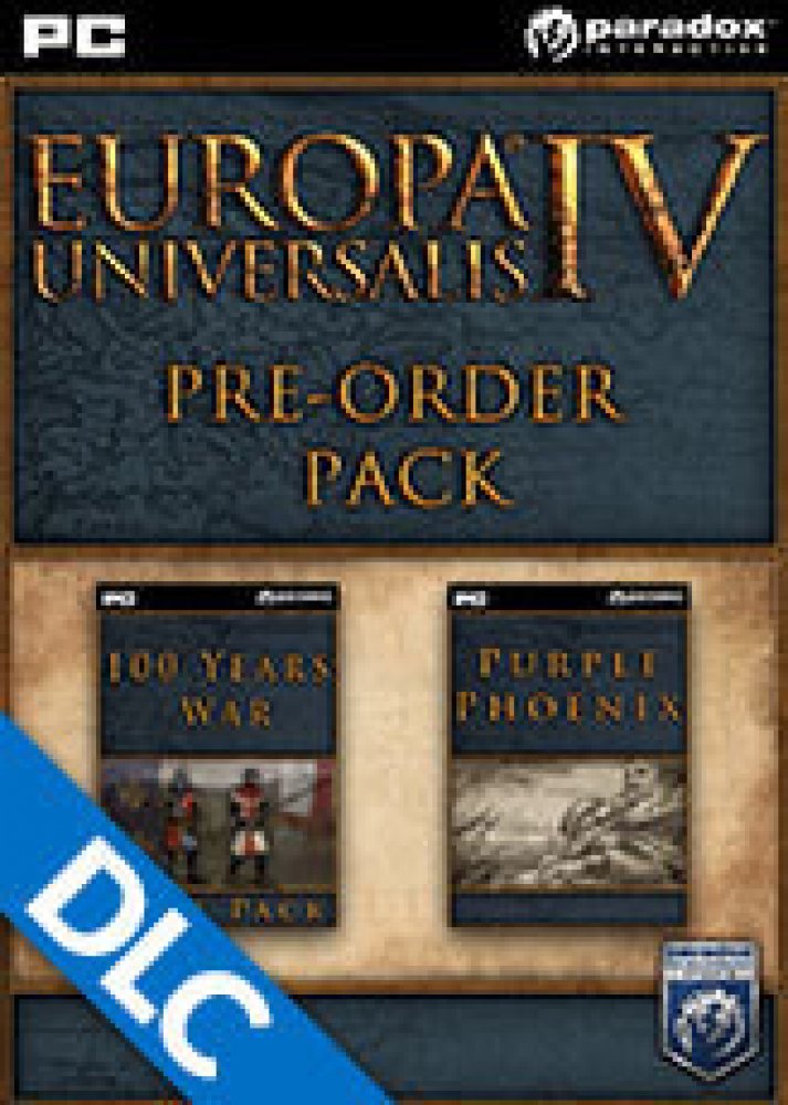 Balíček Pre-order k Europa Universalis IV obsahuje:-Europa Universalis IV: The 100 Years War Unit Pack - sto let bojovala Anglie a Francie o trůn Francie, přičemž zatáhly do konfliktu spoustu svých spojenců. 100 Years War Unit Pack obohacuje zážitek z Europa Universalis IV přidáním nových, unikátních modelů jednotek valčících se národů. Balíček obsahuje 11 modelů pěších jednotek Anglie, Francie, Skotska, Burgund a spousty dalších.-Europa Universalis IV: The Purple Phoenix Expansion - V roce 1444, kdysi hrdá Byzancie je už jen stínem své zašlé slávy. Předehnaná svými mocnými sousedy se Byzantská říše dostala do prekérní pozice. Důležité obchodní město Konstantinopol ohrožuje Ottomanská armáda, konec se blíží, ale purpurový fénix ještě může vstát z popela staré říše.-Europa Universalis IV: Purple Phoenix DLC přidává nové, unikátní událost, tématické obrázky událostí a několik nových modelů jednotek pro Byzantskou říši.