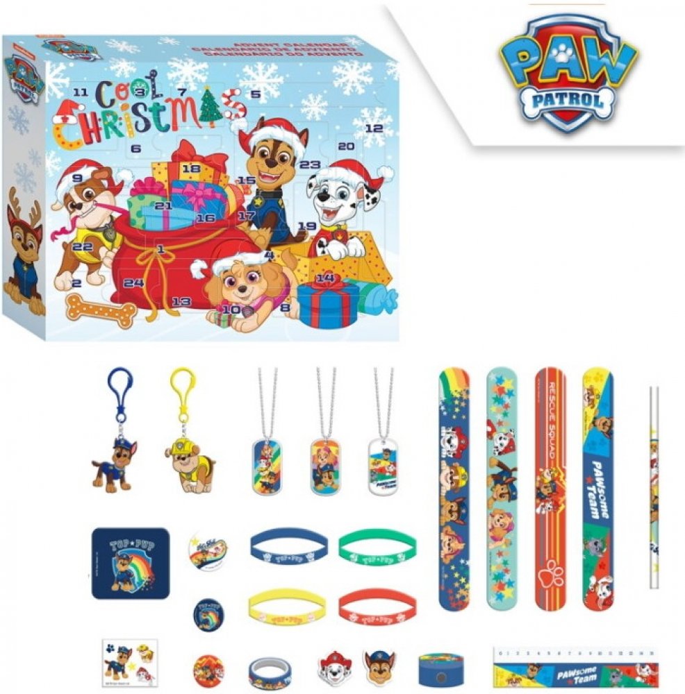 EUROSWAN vlasové doplňky Tlapková Patrola. Doplňky s motivy Paw Patrol. Netradiční adventní kalendář Paw Patrol Vánoce. Skvělý dárek, který pomůže překonávání dlouhých dnů do Štědrého dne. Každý den děti otevřou jedno okénko a naleznou v něm 1 z 24 dárečků jako pravítko, 2 gumy, ořezávátko, tužku, froté potítko, samolepky, úzkou lepící pásku s obrázky, přívěsky na klíče, řetízky s přívěskem, silik...