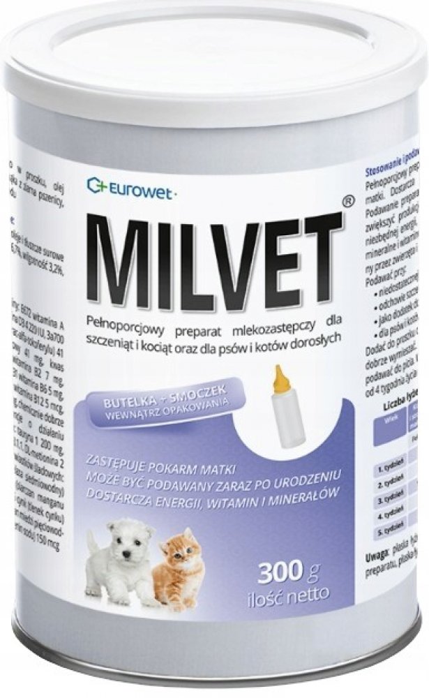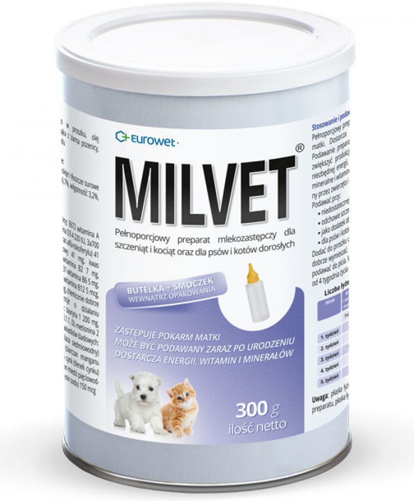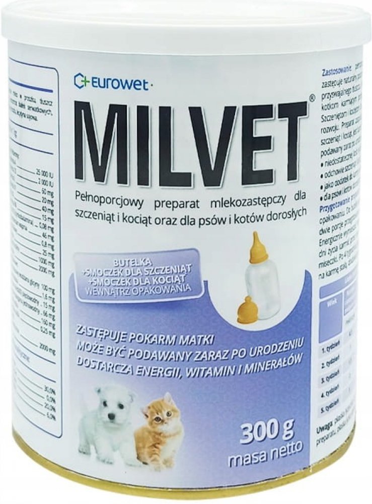 Účinek:Kompletní mléčný náhražkový přípravek dokonale nahrazuje přirozenou krmivo matky. Poskytuje lehce stravitelné bílkoviny a snadno stravitelný tuk. Podávání mléčného náhražkového přípravku fenám a kojícím kočkám pomáhá zvýšit produkci jejich vlastního mléka. Štěňatům a koťatům dodává potřebnou energii, vitamíny a stavební prvky pro jejich vývoj. Přípravek uspokojuje minerální a vitamínové potřeby rostoucích štěňat a koťat. Je velmi dobře vstřebáván zvířaty a může být podáván ihned po narození. Použití a dávkování:Podávejte při:
