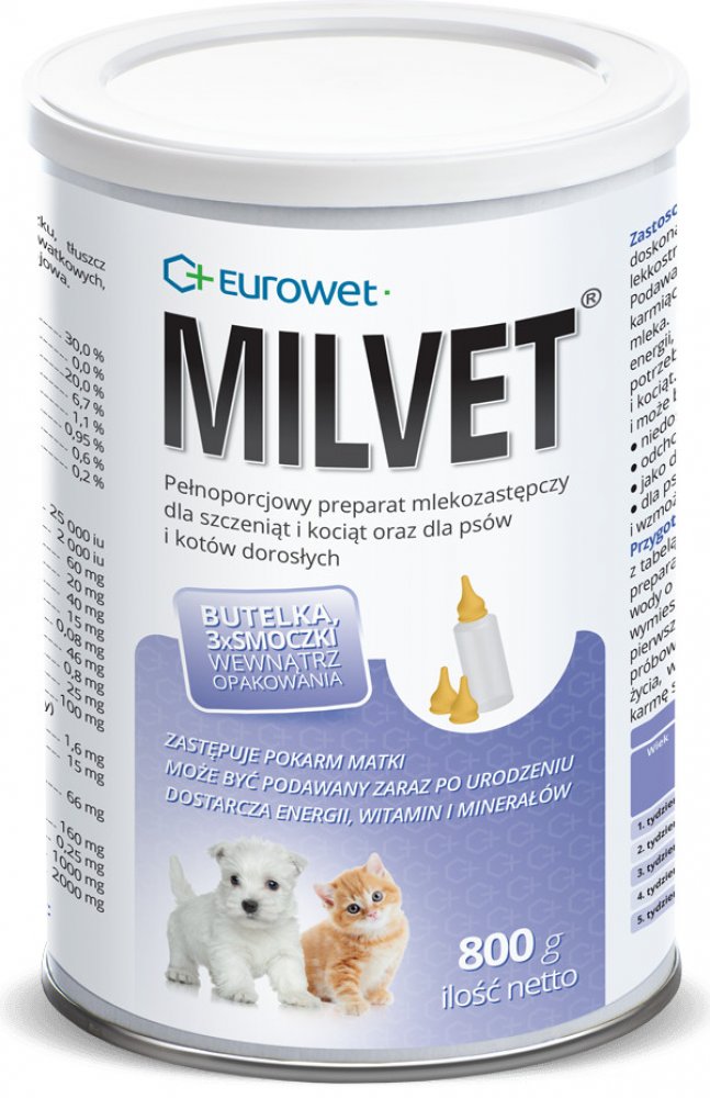 Eurowet Milvet Náhradní mléko kočka/pes 800gKompletní mléčná náhražka pro štěňata a koťata a pro dospělé psy a kočky