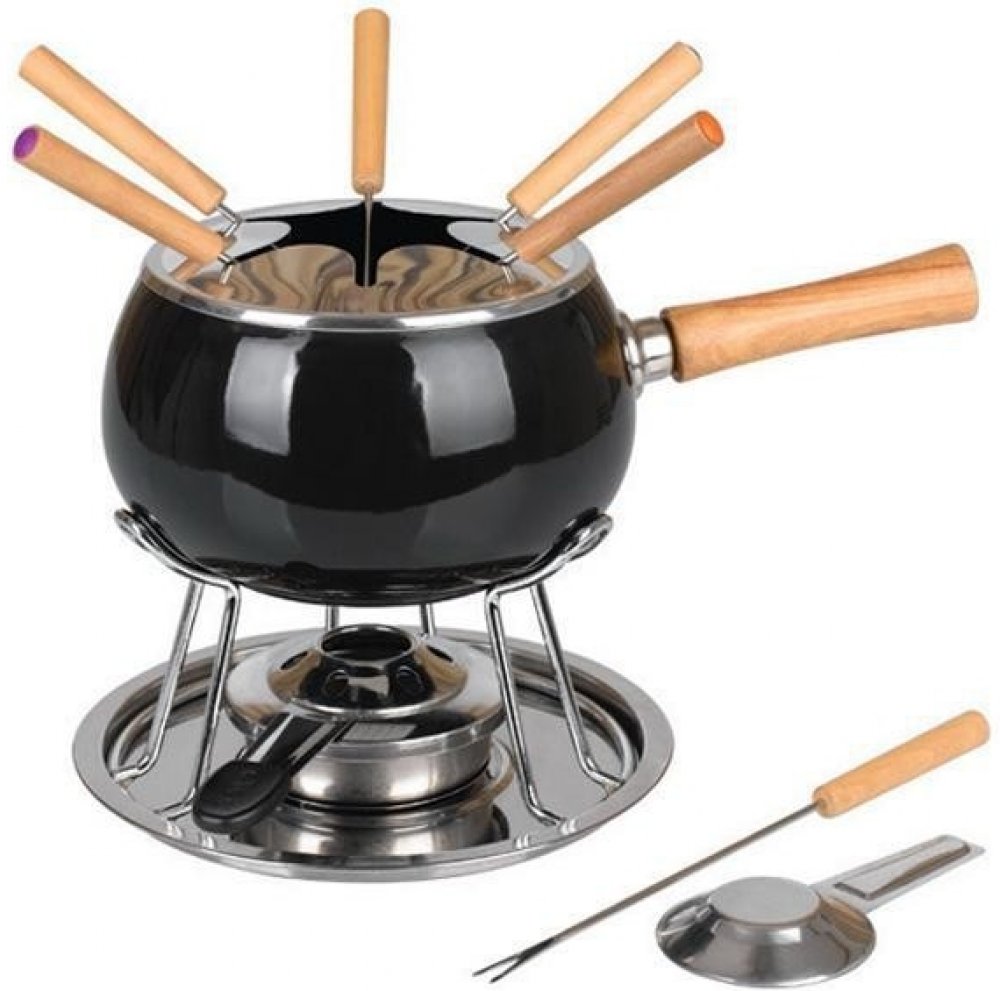 Fondue 12 ks 1 fondue smaltovaná nádoba z nerezové oceli s dřevěnou rukojetí 1 Splash kryt - nerezové víko 1 chromvá tření miska -úkapová 1 nerez podstavec 1 kahan 6 vidliček fondue z nerezové oceli s dřevěnou rukojetí 1 kuchařka s bezpečnostními p