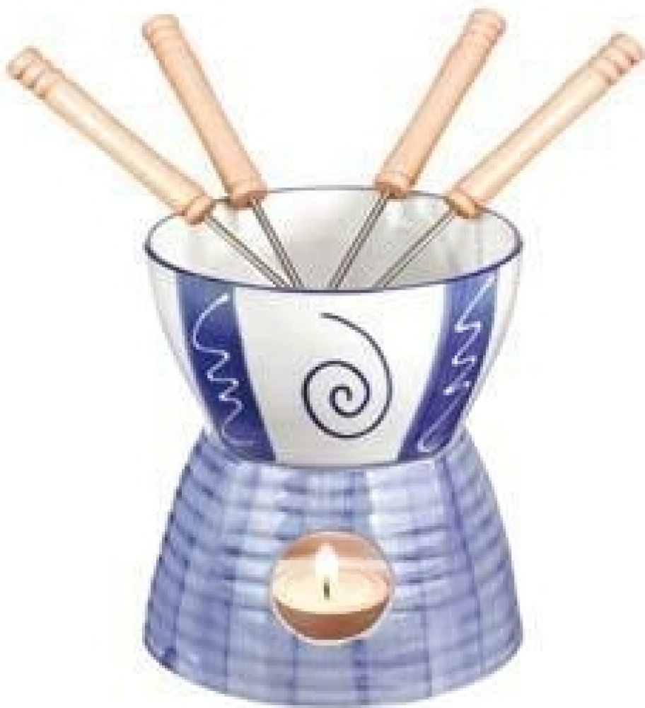 Čokoládové fondue pro 8 ks 070011 1 / 24 PB 80045377001141 miska na fondue keramické barvybílá s modrou dekorace ručně malované1 réchaud keramické modré ručně malované1 svíčku4 fondue vidličky s dřevěnou rukojetí1 kuchařka s pokyny pro bezpečn
