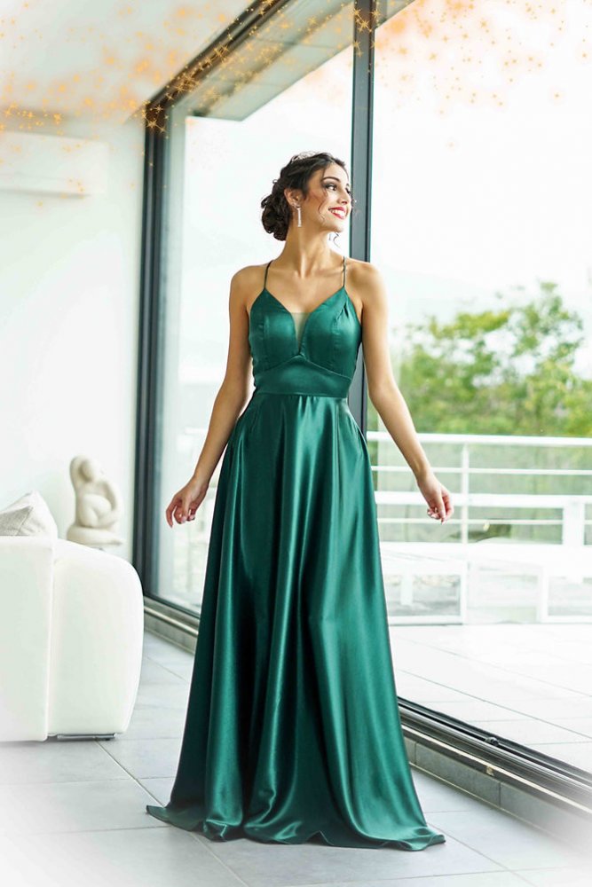 Saténové společenské plesové dlouhé šaty krásné zelené barvě.