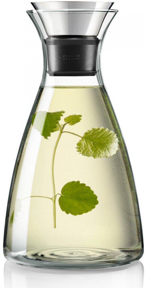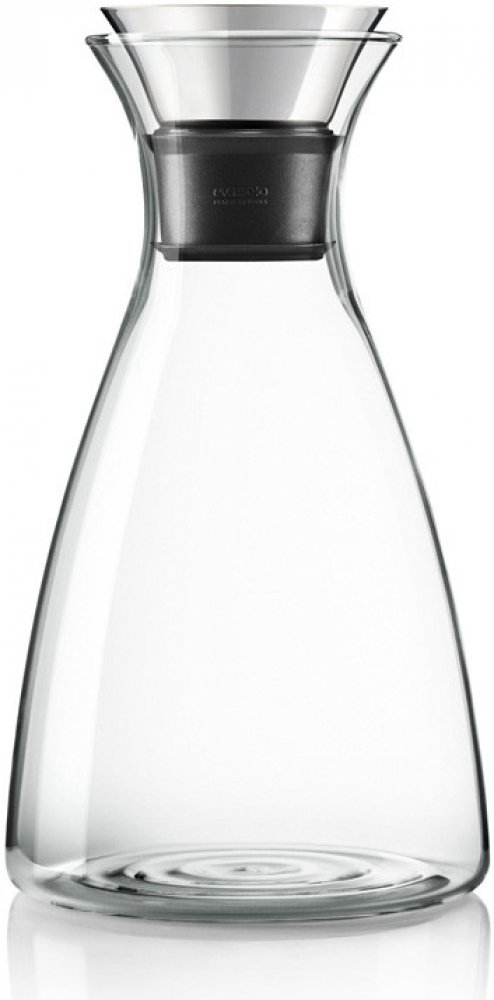 Funkční elegantní karafa Eva Solo s patentovaným nalévacím rtem z nerezové oceli a silikonu vhodná k uchovávání a servírování studených i horkých nápojů .