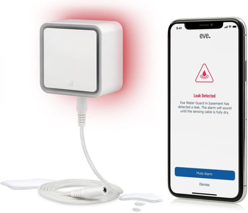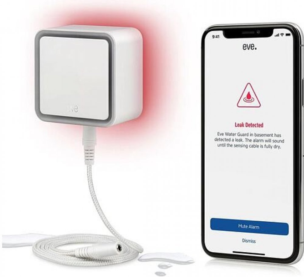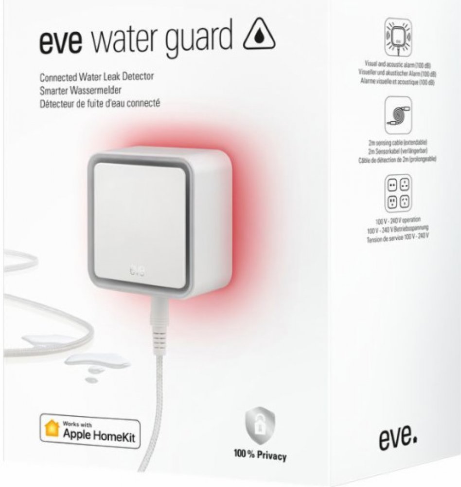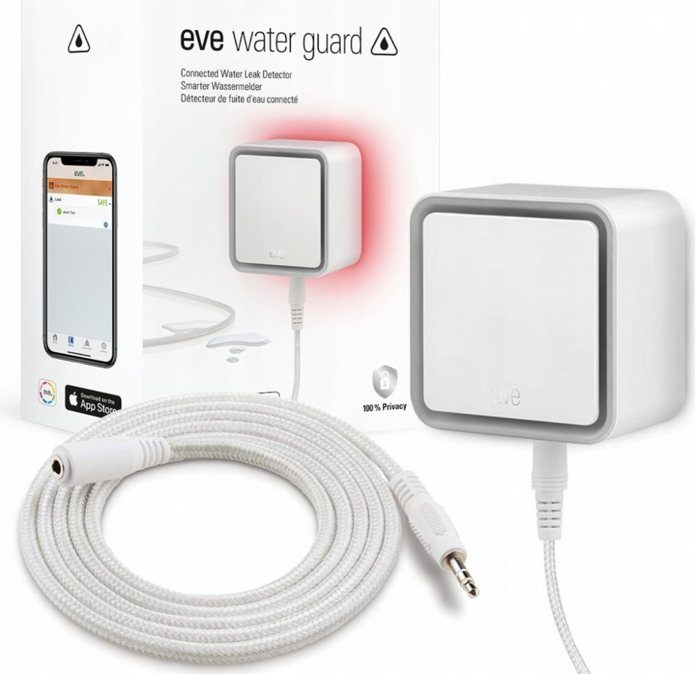 tDetektor Eve Water Guard vás spolehlivě informuje o případném úniku vody v domácnosti. Při úniku vody, ať již z vaší pračky, ve sklepě či z jiného místa, vás o něm informuje vizuálně, akusticky i prostřednictvím aplikace Eve ve vašem chytrém mobilním zařízení. Aplikace vám rovněž připomene bezchybné fungování detektoru. Balení obsahuje snímací kabel o délce 2 m, který lze prodloužit na 150 m a kt...