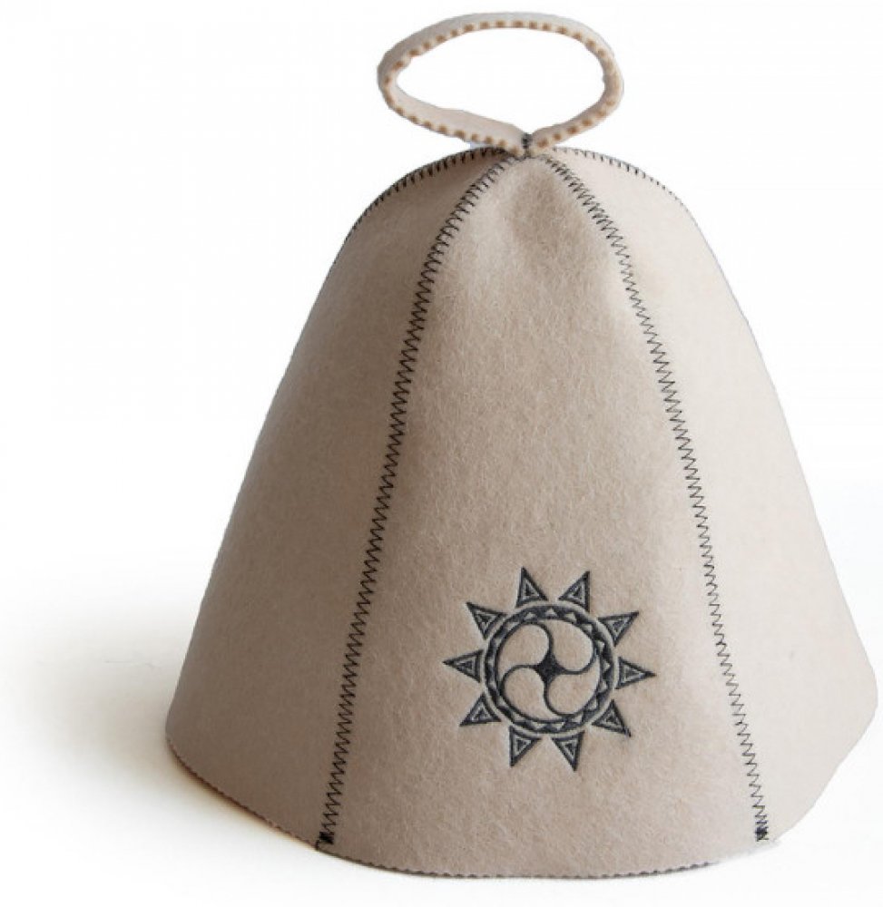 Tradiční vlněná saunová čepice v jemné barvě s originální černou výšivkou – představuje kombinaci vitality (slunce) a rovnováhy/energie (trojitý vír).