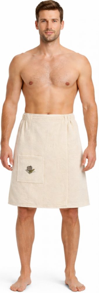 Kilt do sauny pánsky 100% bavlna Krémová Bavlněný dámský kilt je měkký, hebký velmi příjemný na dotek. Je vhodný nejen do sauny, ale také může být použit k zabalení svého těla po sprchealebo koupeli místo ručníku. Kilt má stahovací gumu a zapíná se pomocí suchého zipu. Má praktické kapsa s vyšitým obrázkem. Proč kilt do sauny ze 100% bavlny? bavlněné vlákno absorbuje vlhkost má antistatické vlastn...