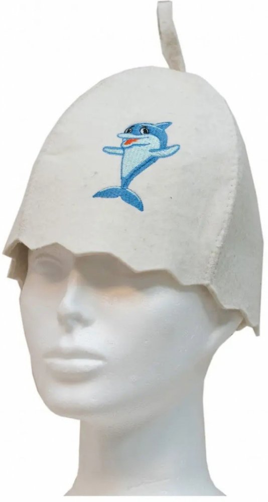 Dětský klobouk do sauny s výšivkou delfína je vyroben ze směsi vlny a polyesteru. Tematická výšivka na čele.