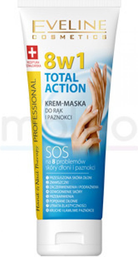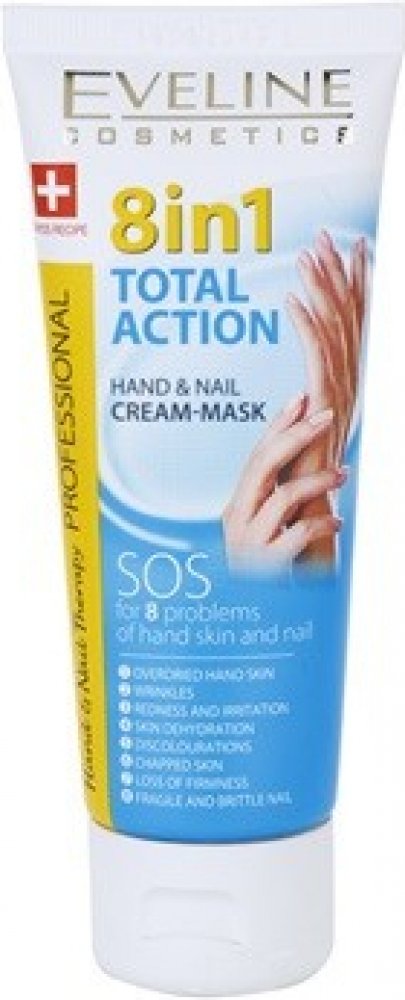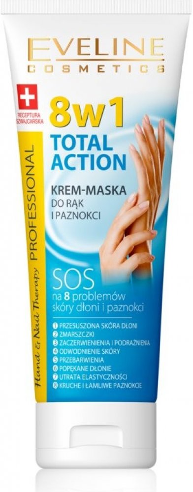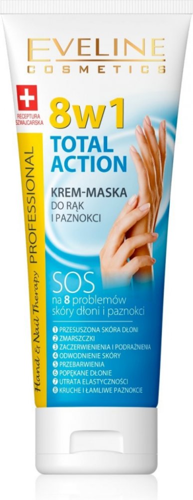 Multifunkční krém – maska na ruce a nehty Total Action 8v1 komplexně a profesionálně regeneruje suchou kůži na rukou a zajistí ji hydrataci po celý den. Zklidňuje podrážděnou a poškozenou pokožku a posiluje křehké nehty. Inovativní švýcarská receptura je bohatá na účinné látky, díky kterým je pokožka rukou dokonale hydratována, vyživená a chráněna před škodlivými faktory. Krém účinně zvládá 8 hlavních kožních problémů rukou a nehtů a poskytuje jim kompletní péči.