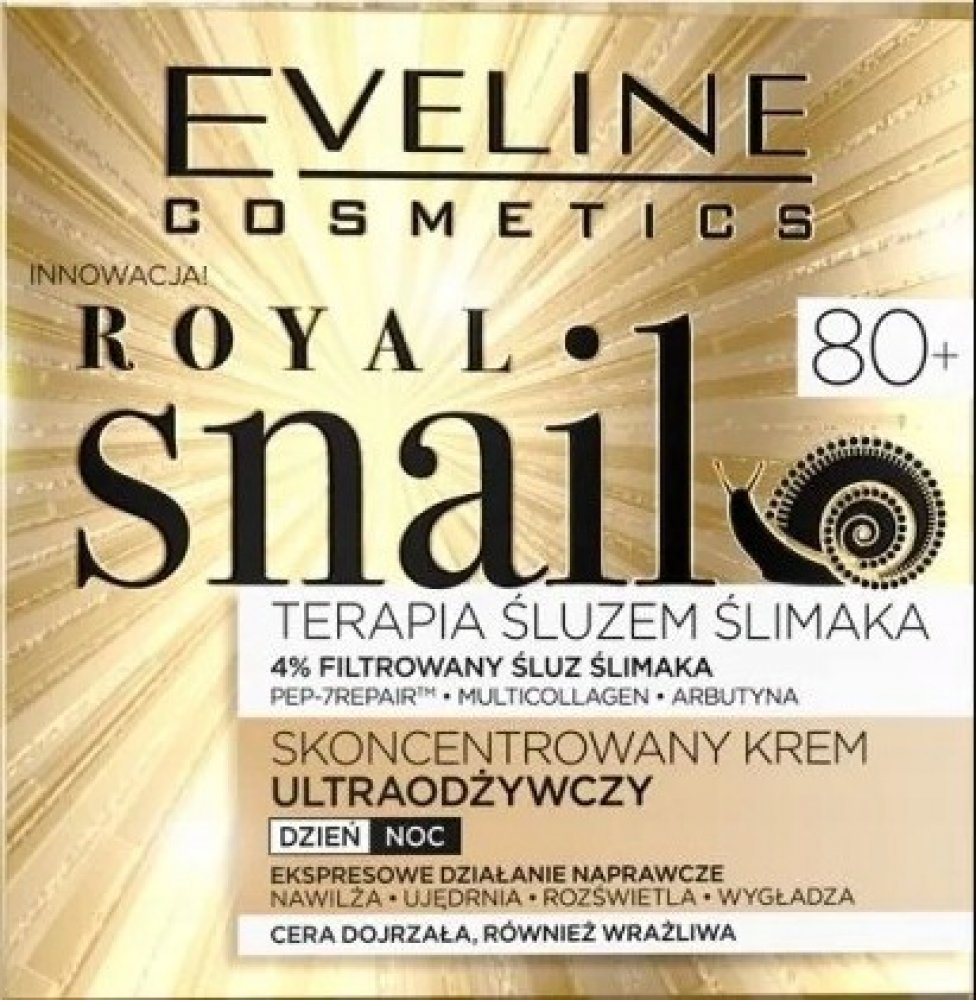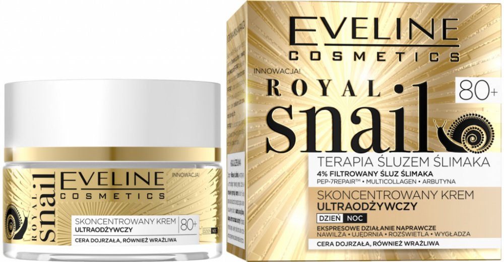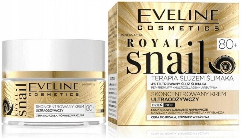 KONCENTROVANÝ ULTRAVÝŽIVNÝ KRÉM ROYAL SNAIL je určen pro ženy po dokončení 80. roku života. Dokonale vyplňuje vrásky a zlepšuje pevnost pokožky. Kombinace filtrovaného hlemýždího slizu a dalších účinných látek obsažených v krému má za následek výrazné zvýšení hustoty a pevnosti pokožky a vyplnění velmi hlubokých vrásek. Arbutin vykazuje rozjasňující a vyrovnávací vlastnosti tónu pleti a Multicollagen je zodpovědný za udržení správné hydratace pokožky a obnovení jejího správného napětí. Díky heptapeptidu PEP-7REPAIR je pokožka pevnější a lépe vyživená.