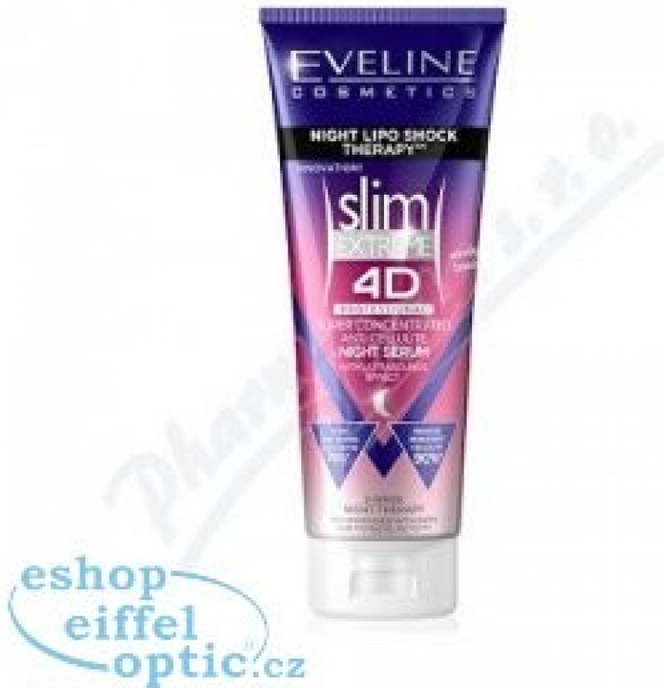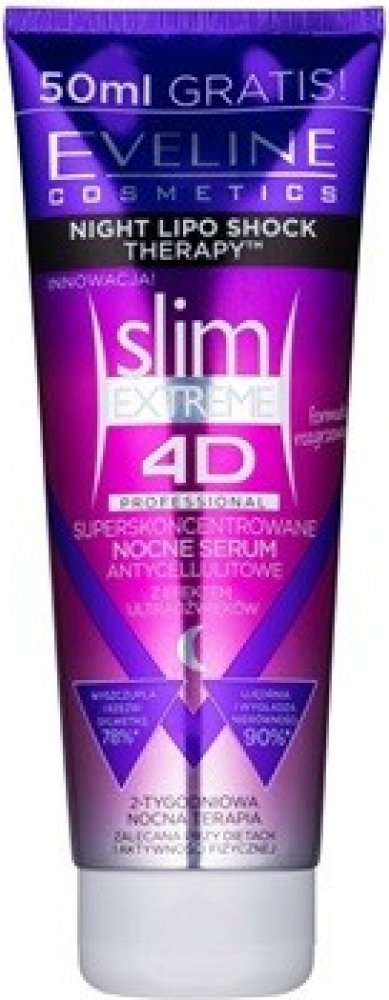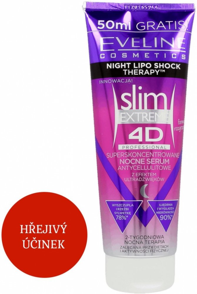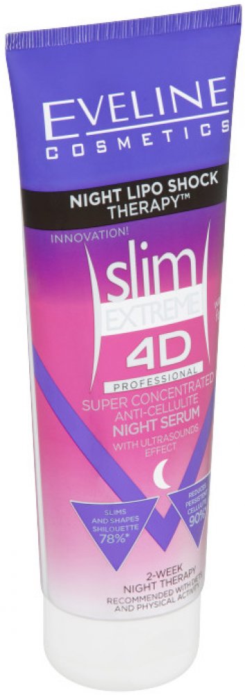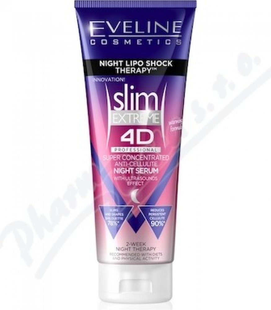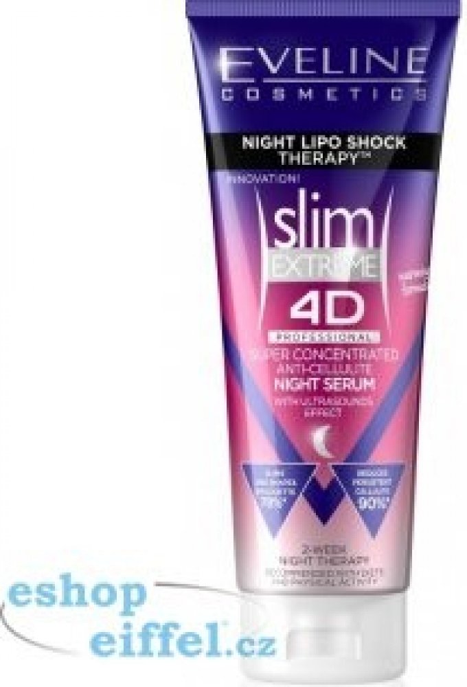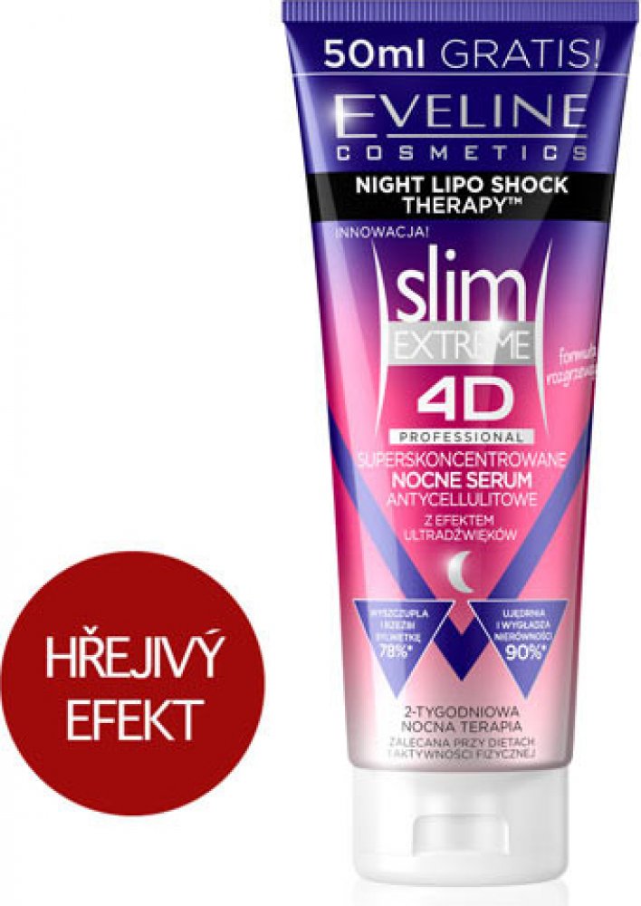 Super koncentrované noční sérum Eveline Slim Extreme 4D Night Lipo Shock Therapy s hřejivým účinkem poskytuje 2-týdenní noční terapii. LIPO Shock noční sérum je moderní přípravek navržený pro 2-týdenní intenzivně zpevňující proces doporučený během diety a zvýšené fyzické aktivitě a jako doplněk při denním ošetření pokožky s celulitidou.