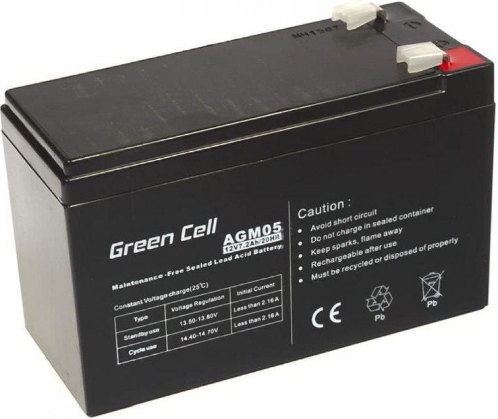Baterie typu AGM jsou absolutně bezúdržbové, odolné proti vytečení elektrolytu a bezpečné.Technické parametry:Výrobce: Green CellTyp: VRLA AGMKapacita: 7.2AhNapětí: 12VŽivotnost: 5 letTyp pólu, konektor: Faston 250 (F2)Integrované zabezpečení: přepěťové, proti přehřátí, proti hlubokému vybití, proti přebitíKód produktu: AGM05Použití: