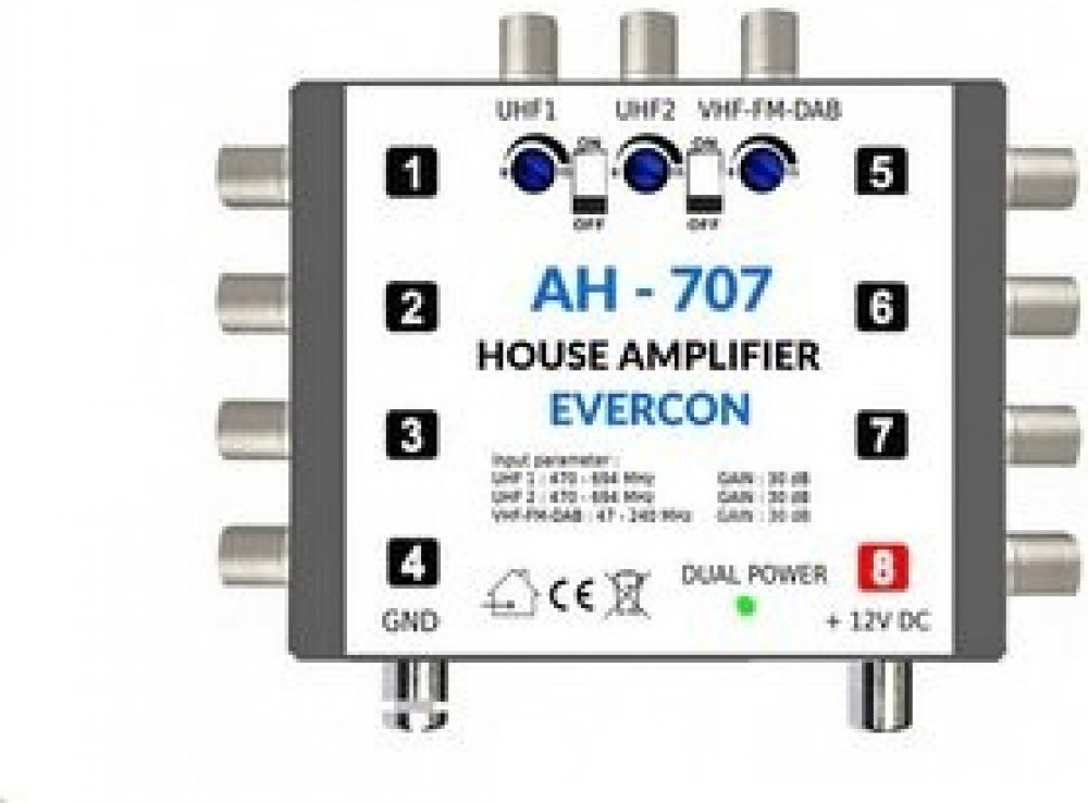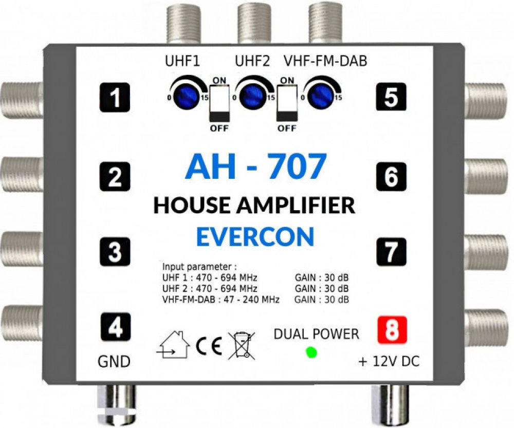 napájení 12V / 80mA, UHF 470-694MHz, DAB/FM/VHF 47-240MHz Anténní zesilovač AM-707 5G byl navržen speciálně pro podmínky Česka a Slovenska.