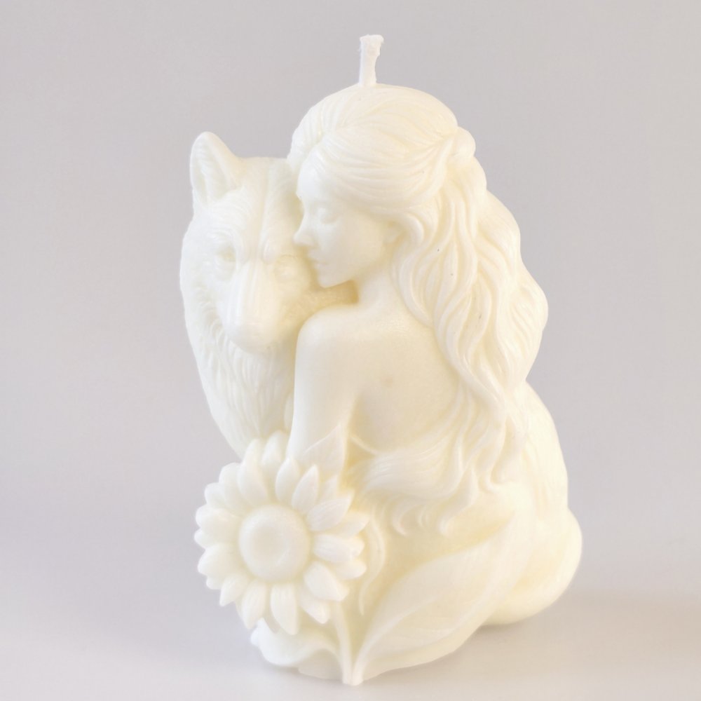 Symbolika ženy a vlka může evokovat sílu, citlivost a hluboké propojení s přírodou, což dělá z této svíčky zajímavý doplněk interiéru i smysluplný dárek pro zvláštní příležitosti.