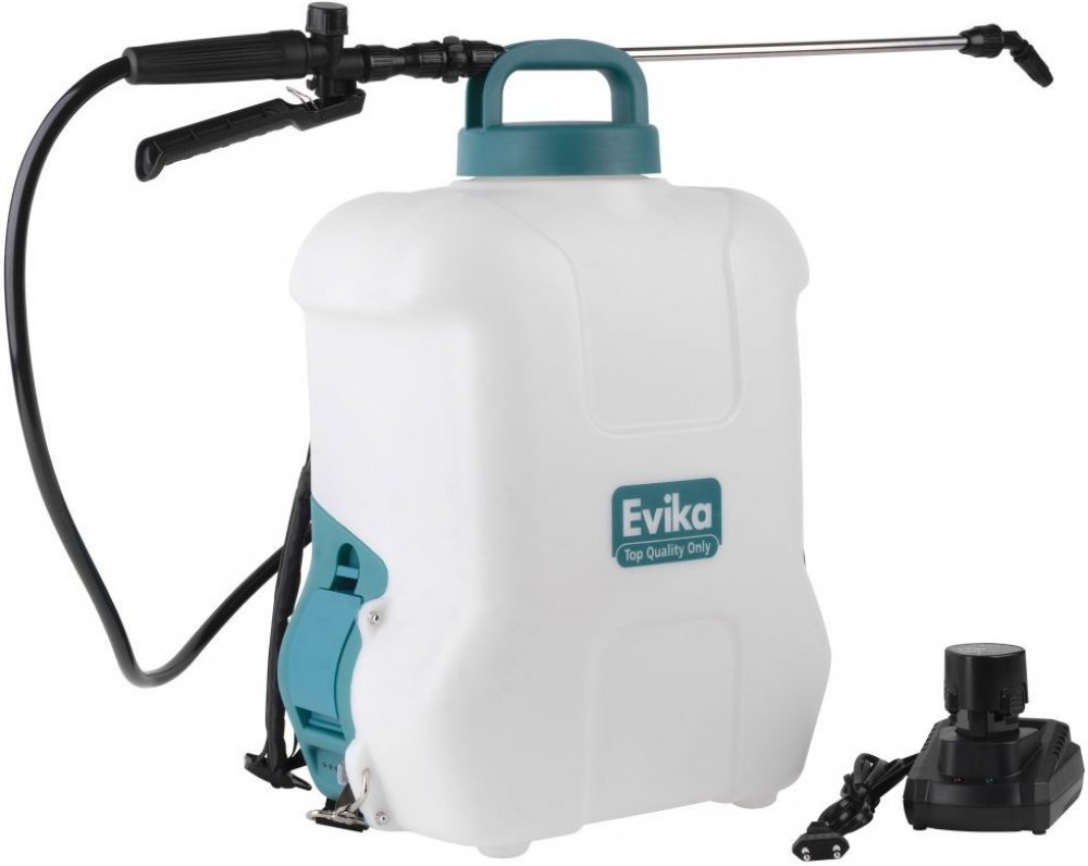 Akumulátorový zádový postřikovač plastovou nádobou. Postřikovač nalezne uplatnění při ošetřování rostlin na polích, v zahradnictvích, nebo doma na zahrádce. Tvar nádrže je uzpůsobený k pevnému dosednutí na záda a široké popruhy zajišťují pohodlné nesení. Široký nalévací otvor usnadňuje nalévání postřiku, ale i čištění postřikovače po použití.