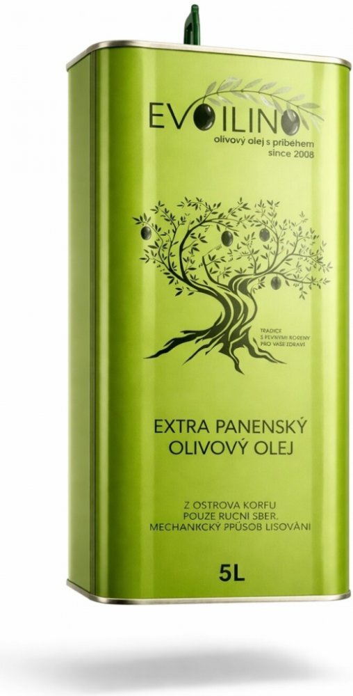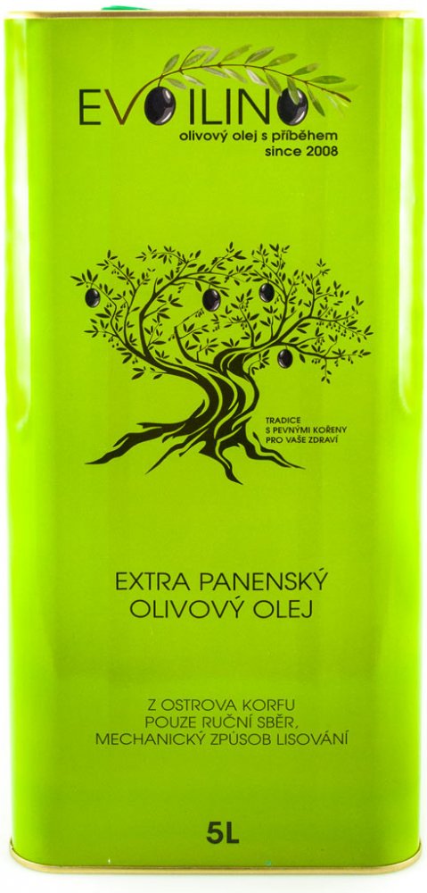 Evoilino Korfu Extra panenský olivový olej 5l je olivový olej 1. kategorie, který nepřesahuje kyselost 0,8% – náš z letošní sklizně má kyselost 0,4%, je to olej nejvyšší kvality. Olivy si sbíráme sami, přímo z našich olivovníků, které rostou v severní části ostrova Korfu a nejsou chemicky ošetřovány, ani do koruny stromů, ani chemicky přihnojovány ke kořenům.