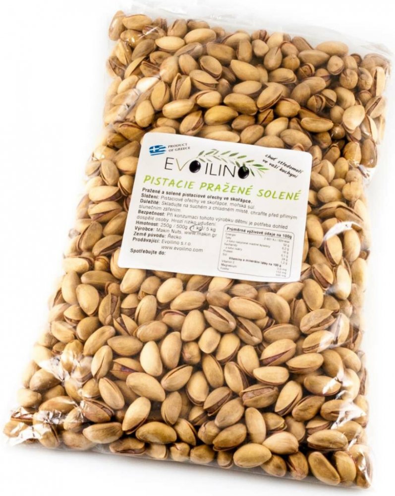 VýrobceMakin Nuts, Almyros, Volos, Řecko– Vysoké kvality ze sběru podzim 2025– z pevninského Řecka, z oblasti Megara (naproti pistáciovému ostrovu Aegina)– prodávající: Evoilino s.r.o.– Zdroj energie, plné minerálů a vitamínů– Jsou plné antioxidantů– Vitamíny : A, B1, B2, B3, B5, B6, B7, E. C– Minerální látky : mangan, draslík, hořčík, vápník, fosfor, železo, zinek– Obsahují : proteiny, omega 3 mastné kyseliny