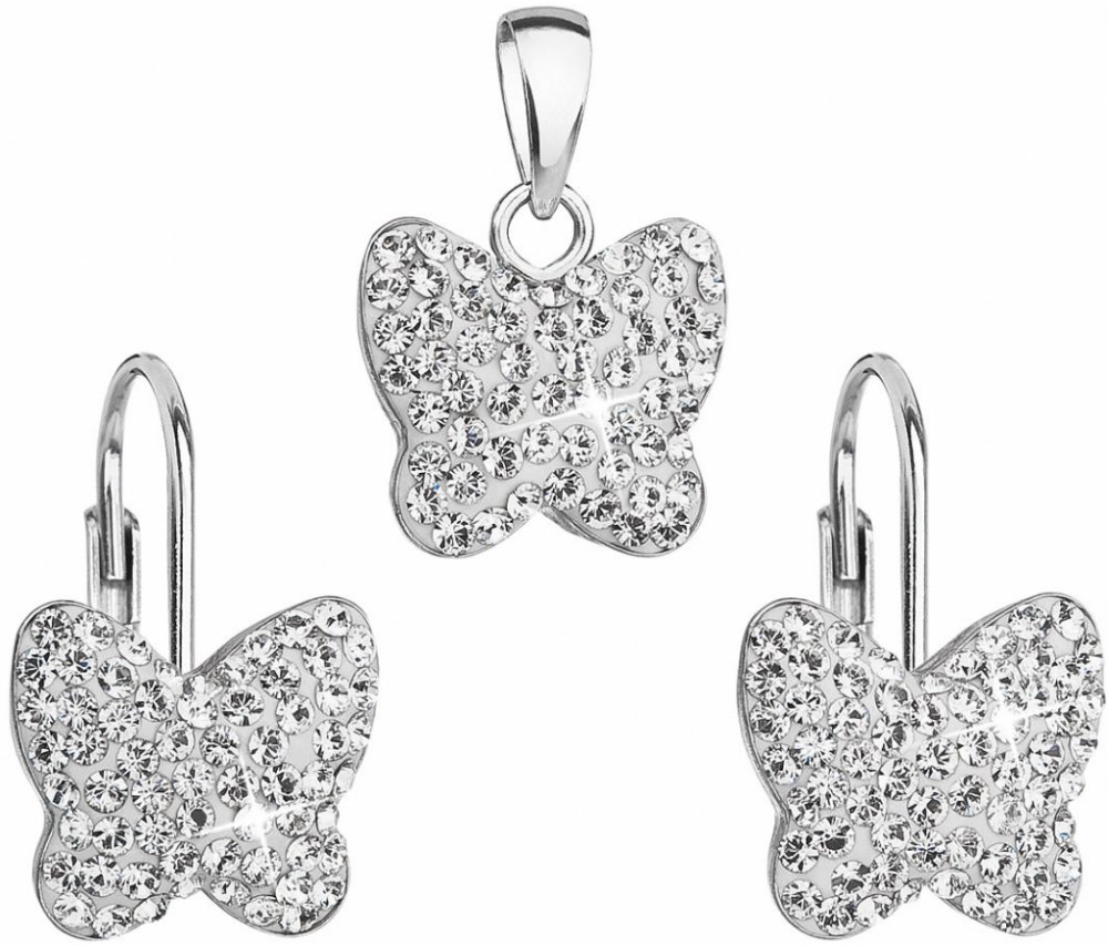 Souprava 39144.1 obsahuje visací náušnice a přívěsek ve tvaru motýlků. Šperky jsou vyrobeny ze stříbra ryzosti 925/1000, které prošlo povrchovou úpravou rhodiem. Rhodium chrání šperk proti zčernání, zežloutnutí i poškrábání. Přívěsek i náušnice jsou bohatě zdobeny třpytivými Preciosa krystaly v bílé barvě. Náušnice mají zapínání na klapku. Jelikož šperky neobsahuji žádný přídavek niklu, mohou je bez obav nosit i alergici.