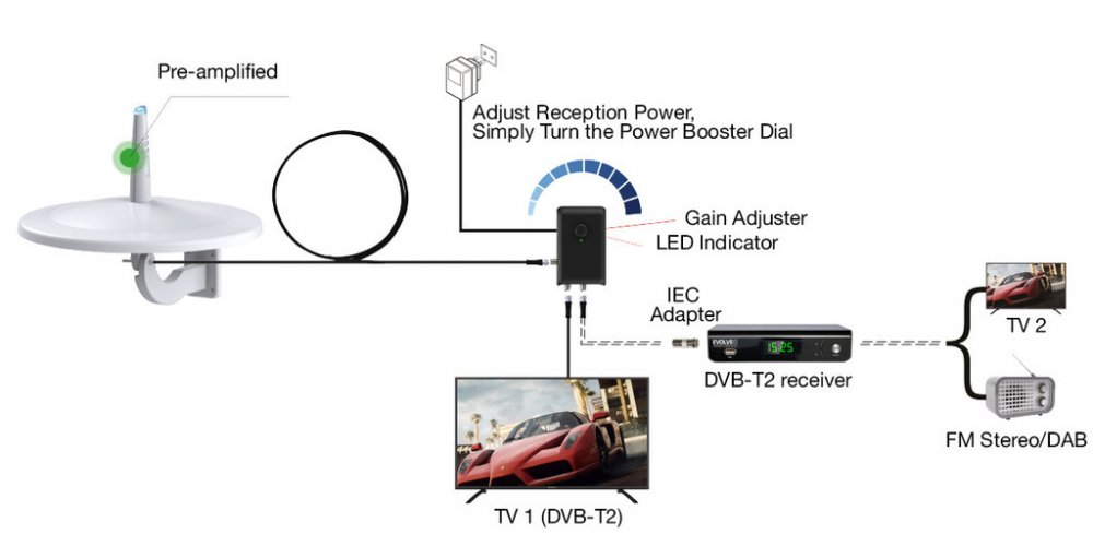 S anténou je možný příjem signálu 360° ve vertikálním směru a 360° v horizontálním směru. Díky tomu může anténa přijímat signál ze všech typů pozemních vysílačů vysílajících DVB-T2 signál.