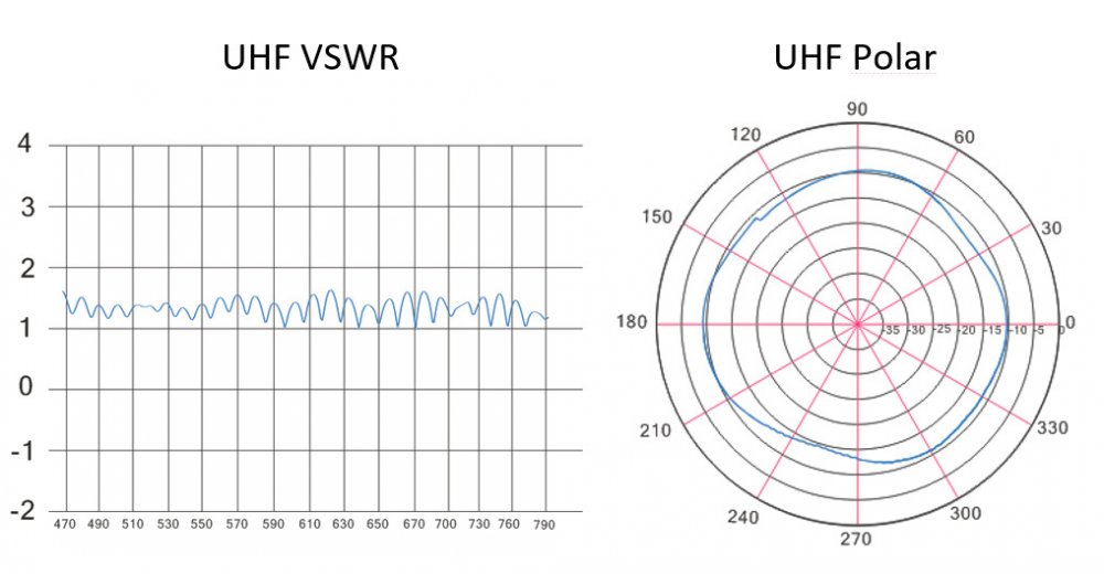 UHF VSWR graf zobrazuje účinnost antény v pásmu UHF. Koeficient rovný 1 znamená přeměnu všech elektromagnetických vln na elektrický signál. S grafem UHF Polar je možné pozorovat oblasti prostoru antény s nejlepším ziskem. Anténa Jade 3 je všesměrová, znamená to tedy možný příjem ve všech směrech.