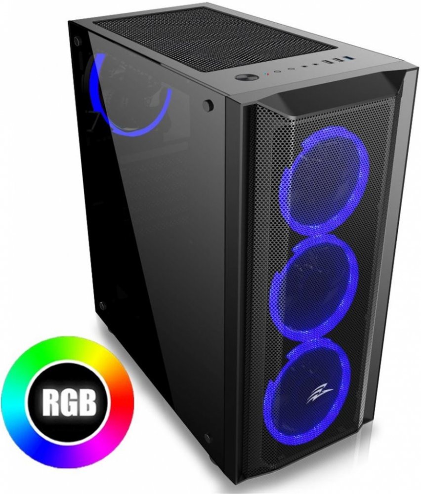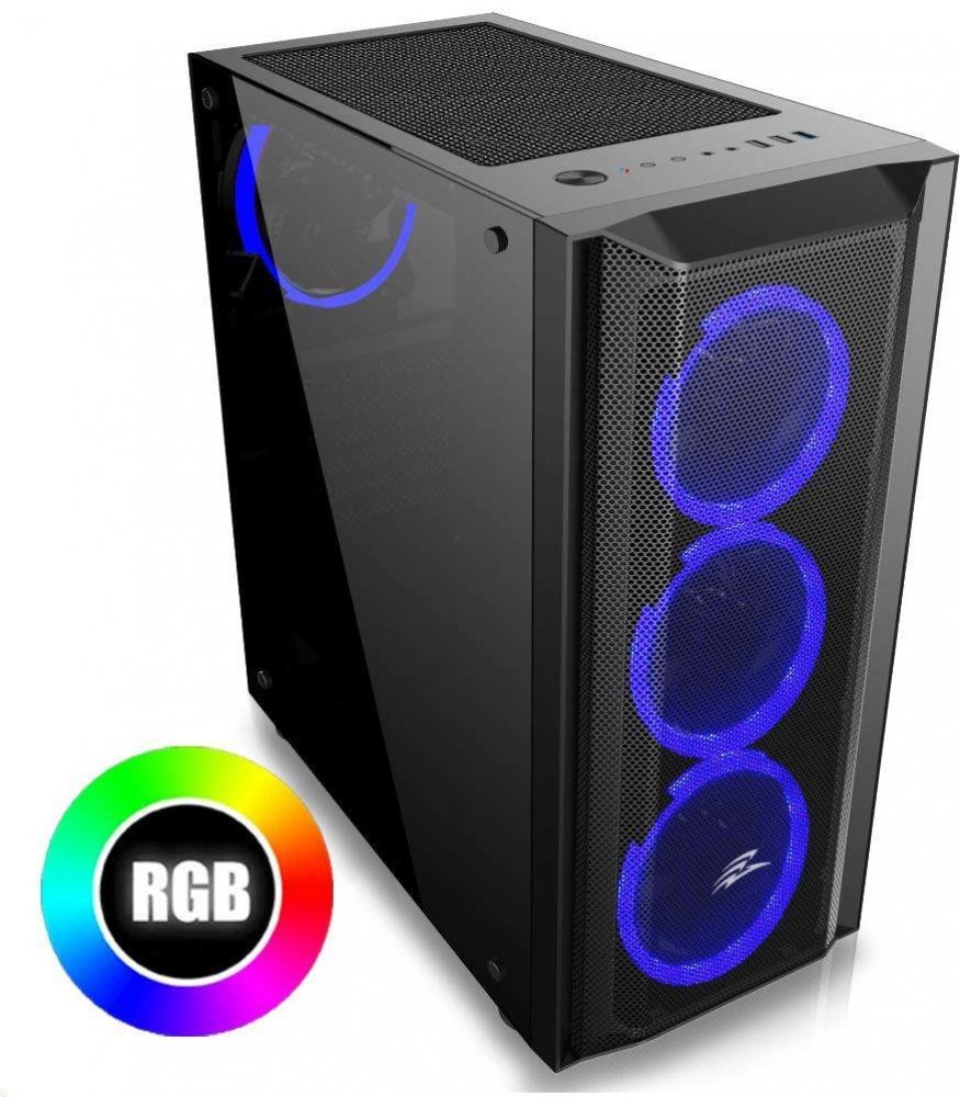 Herní ATX midi tower s instalovanými 4x RGB rainbow 120 mm ventilátory, které se ovládájí pomocí LED tlačítka na horní straně ovládacího panelu. Čelní mřížka přes celý přední kryt zajišťuje efektivní proudění vzduch. Levá strana skříně obsahuje bočnici z tvrzeného skla. Skříň je určená pro základní desky podporující platformu Intel i AMD. Mimo formátu ATX je kompati...