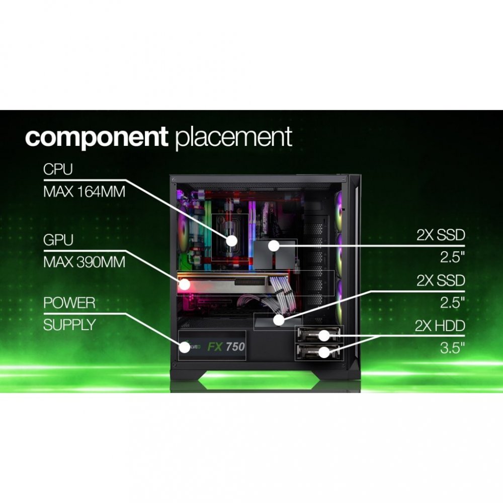 Levá strana PC skříně obsahuje bočnici z tvrzeného skla. Skříň je určená pro základní desky podporující platformu Intel i AMD. Mimo formátu ATX je kompatibilní i s formátem Micro ATXa Mini ITX. Napájecí zdroj se umísťuje do dolní části skříně. Spodní mřížka je osazena vysouvacím prachovým filtrem, horní prachový filtr je uchycený magnety a je odnímatelný. Ventilátory mají 4pin s MOLEX konektory a připojují se vzájemně na sebe bez nutnosti jakéhokoliv řadiče. Ovládání ventilátorů je možné pouze pomocí LED tlačítka na kontrolním panelu skříně.