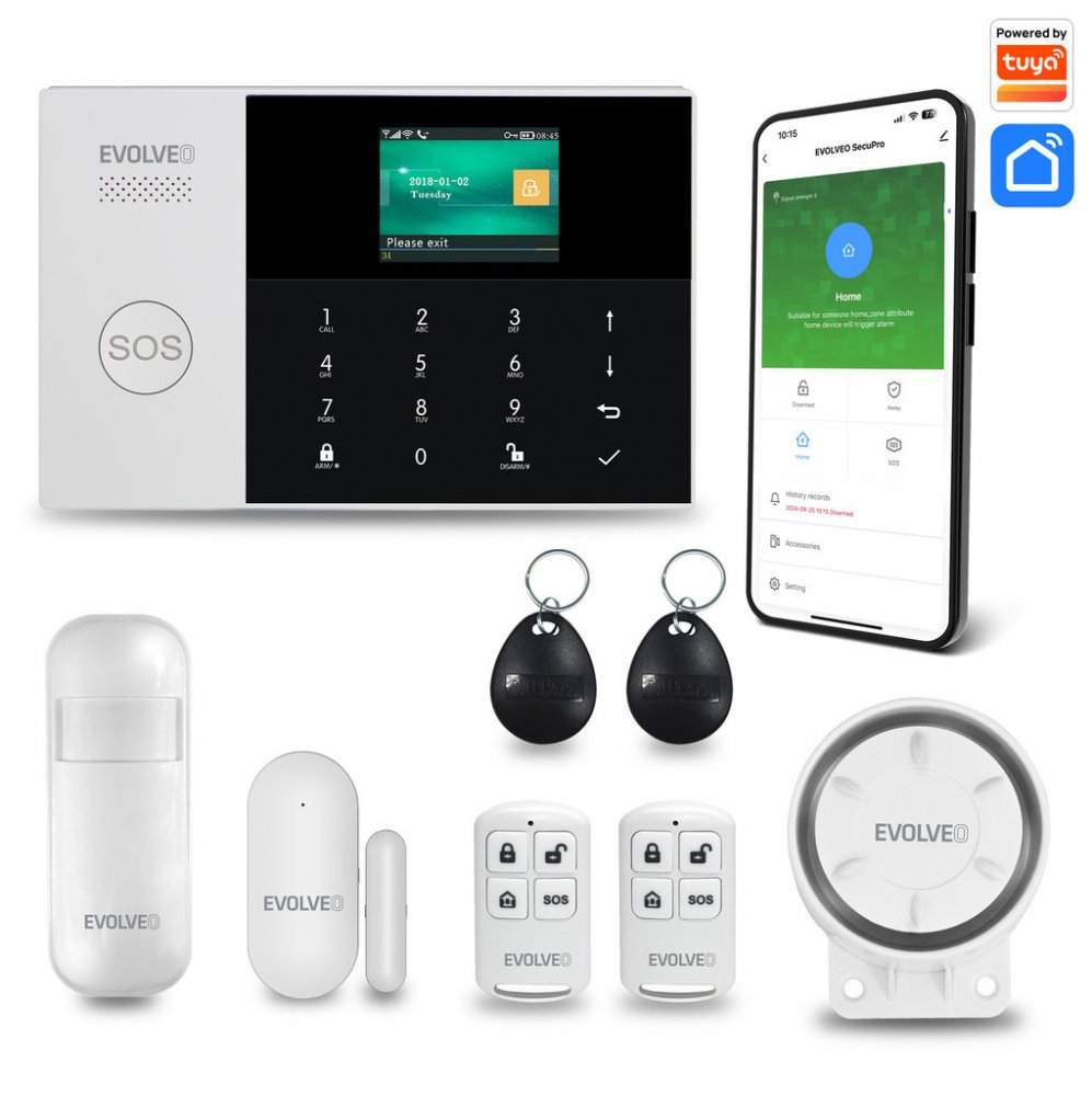 Systém EVOLVEO SecuPro je jako armáda, která chrání pevnost vašeho domu. Jejím velitelem je hlavní jednotka, kterou si doma můžete pomocí přiložené montážní sady pověsit na zeď. Role věrných vojáků pak zastávají dveřní a okenní detektory, pohybový senzor, dále siréna a v neposlední řadě dva dálkové ovladače a dva přívěsky na klíče (pro snadnou aktivaci/deaktivaci alarmu dotykem) – to všechno spolupracuje na jediném cíli: ochránit váš domov.