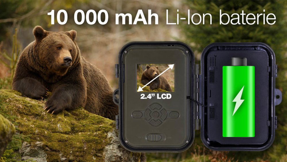 Jeden z důležitých parametrů každé fotopasti je její výdrž na baterii a zároveň i ekonomika provozu, díky nabíjecí 10 000 mAh baterii získáte zařízení s dlouhou výdrží na jedno nabití. Baterie je přímo vybavena nabíjecím konektorem a indikační LED diodou informující o stavu nabíjení.Akumulátor je dokoupitelný jako příslušenství, takže není problém používat dvě baterie, a jednou za několik měsíců jen vybitou baterii v kameře vyměnit za čerstvě nabitou. Samozřejmě že výdrž se může lišit při různých nastaveních (častý záznam videa) a také vlivem okolní teploty, kdy při teplotách bod bodem mrazu výdrž klesá.