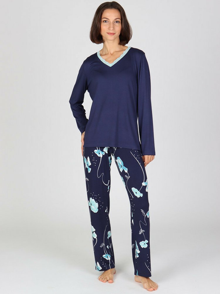 Hledáte pohodlné a zároveň stylové dámské pyžamo, které vám zajistí komfort po celou noc? Dámské dlouhé pyžamo MADEIRA je tou správnou volbou. Díky kvalitnímu materiálu, kterým je kombinace 95 % viskózy a 5 % elastanu, je pyžamo nejen hebké na dotek, ale také příjemně pružné a přizpůsobivé vaší postavě. Vrchní díl tvoří jednobarevné triko, které zaujme nejen vzhledem, ale i detaily. Elegantní ozdobná krajka u výstřihu do V dodává pyžamu ženský půvab, zatímco dlouhé rukávy oceníte zejména v chladnějších dnech. Spodní díl tvoří dlouhé pyžamové kalhoty s potiskem květů, které perfektně ladí s horním dílem a poskytují maximální pohodlí při spánku i odpočinku doma. Tento model je ideální volbou pro každou ženu, která si potrpí na kvalitu, styl a pohodlí. materiál: 95% viskóza / 5% elastan, triko s ozdobnou krajkou u krku výstřih do V a dlouhý rukáv dlouhé pyžamové kalhoty s potiskem Tip: Prohlédněte si nabídku dámského spodního prádla.