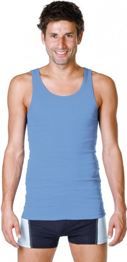 Klasický modrý pánský bavlněný nátělník, který z módy nikdy nevyjde. Dokonale padne každé postavě.