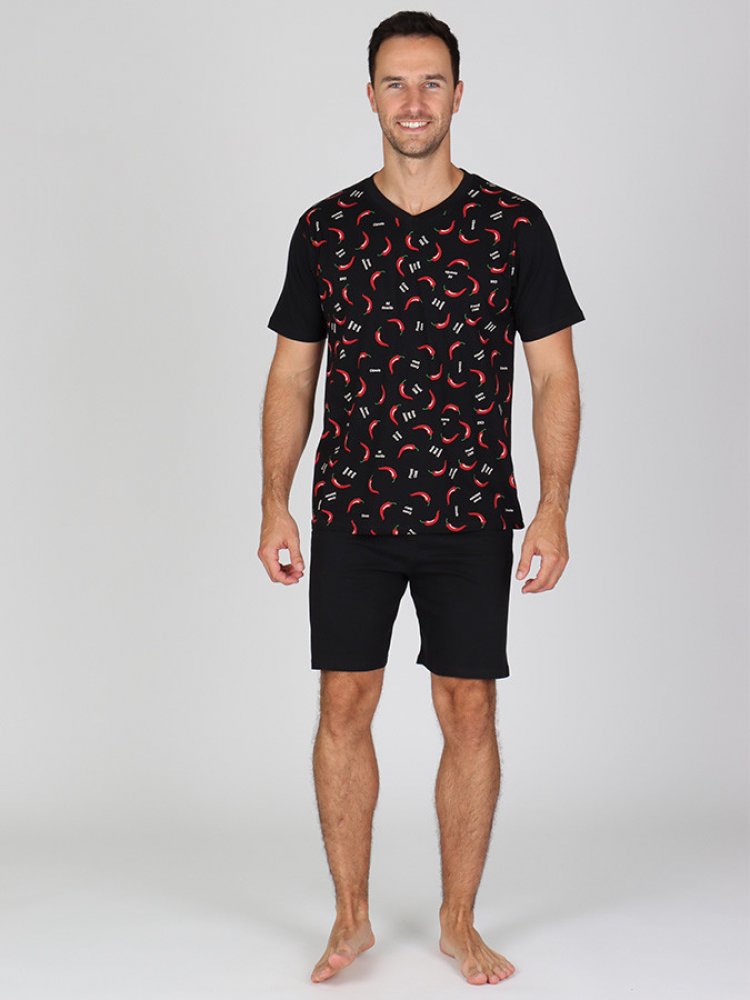 Pánské krátké pyžamo P BODO si zamilují všichni milovníci chilly papriček. Pohodlné bavlněné pánské krátké pyžamo se skládá z trika s drobným potiskem a krátkých kalhot. Toto pyžamo skvěle poslouží i jako dárek!