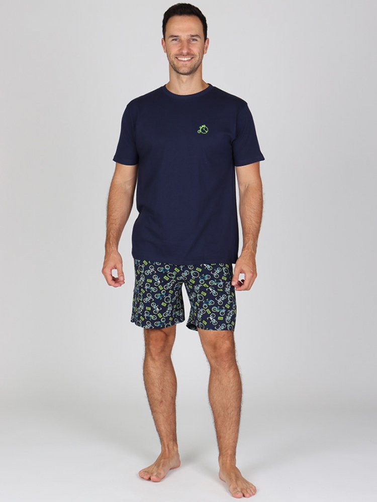 Pánské krátké pyžamo P LEON si zamilují všichni milovníci kol. Pohodlné bavlněné pánské krátké pyžamo se skládá z trika s drobným potiskem a krátkých kalhot s potiskem. Toto pyžamo skvěle poslouží i jako dárek!