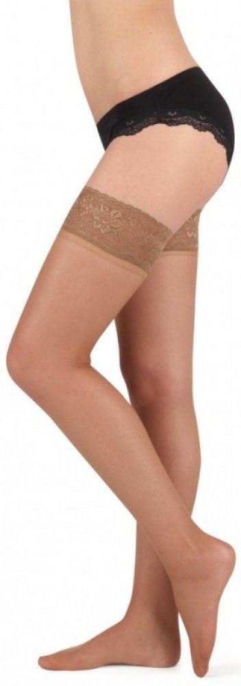 Tělové samodržící punčochy Silvana jsou luxusní elastické punčochy s krajkovým lemem bez zesílené špice. Použité silikonové pásky skryté v horní krajkové části zajišťují vynikající přilnavost k tělu, tak Vám nikdy nesklouznou.