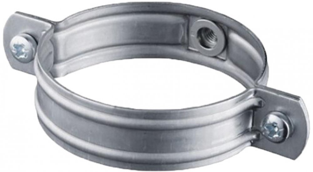 Pozinkovaná objímka určená k upevnění okapových svodů opatřená závitem pro šroub.