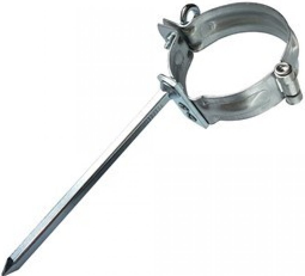 Spona k uchycení svodu o průměru 100 mm s natloukacím trnem délky 140 mm, materiál lakovaný pozink, barva hnědá RAL 8017. Vzdálenost mezi sponami by neměla být delší než 2 m.