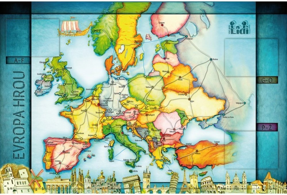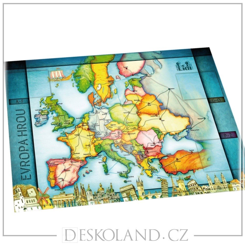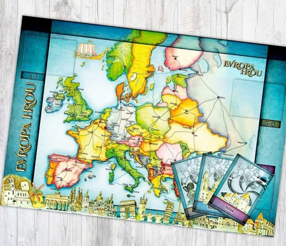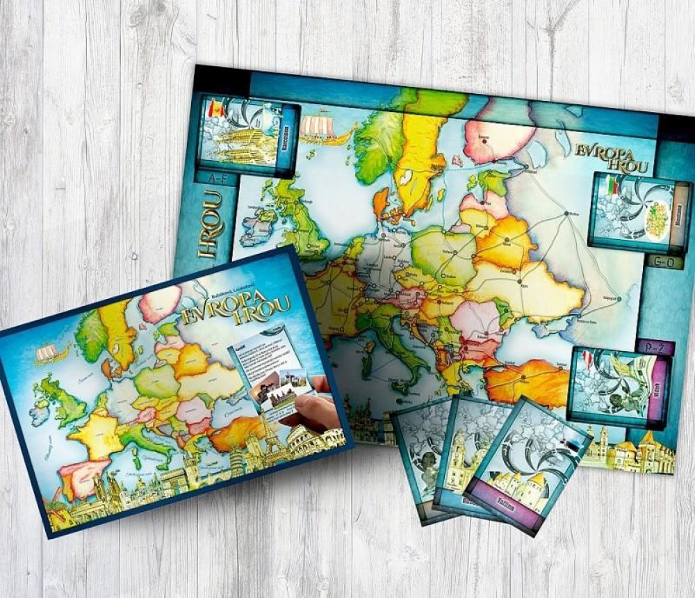 Každý zná italskou pizzu, francouzské víno, nebo Big Ben v Londýně. Co je však typické pro Ukrajinu nebo Kypr? Poznáte vlajku Finska, nebo Švédska? Víte, jaké státy leží u Baltského moře? Při této společenské hře Vám může pomoct samotná mapa, krabice hry EVROPA HROU, nebo karta navštíveného města. Na každé kartě města je zobrazena mapa státu daného města, státní vlajka a typické památky, zvyky, nebo znaky každého státu!!