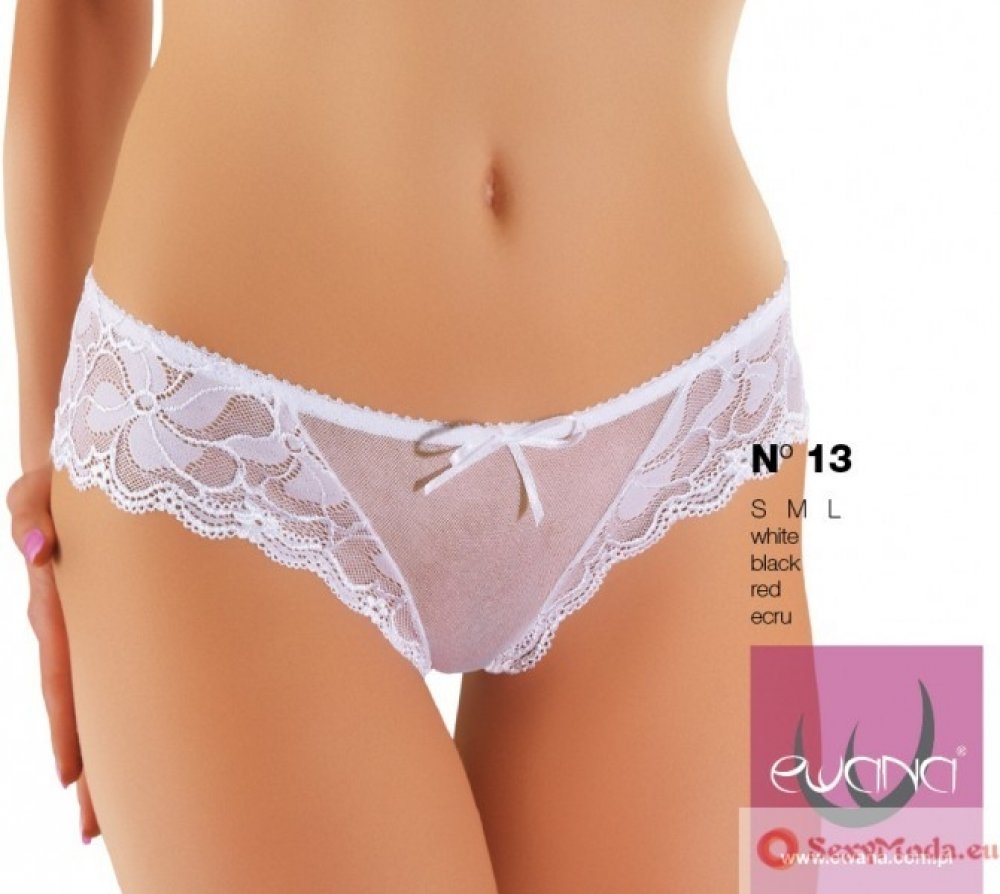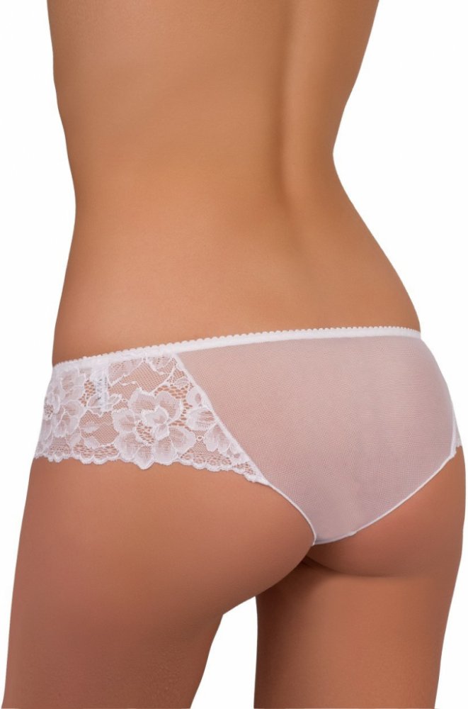 Dámské francouzské kalhotky z průhledného tylu s výraznou květovanou krajkou na bocích. V pase je použita jemná vzorovaná mechová guma doplněná mašličkou. Vnitřní část rozkroku kalhotek je podšita bavlněnou látkou.
