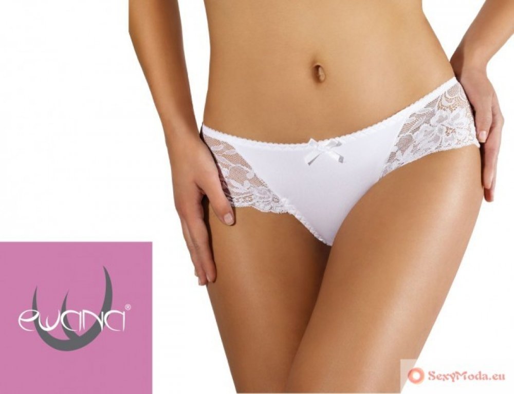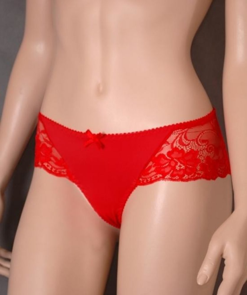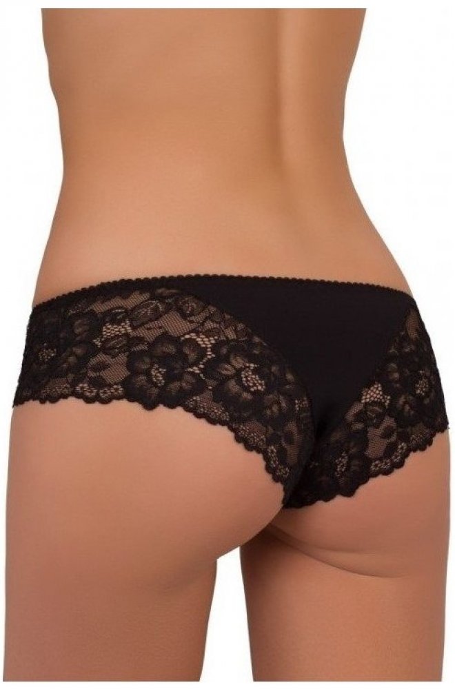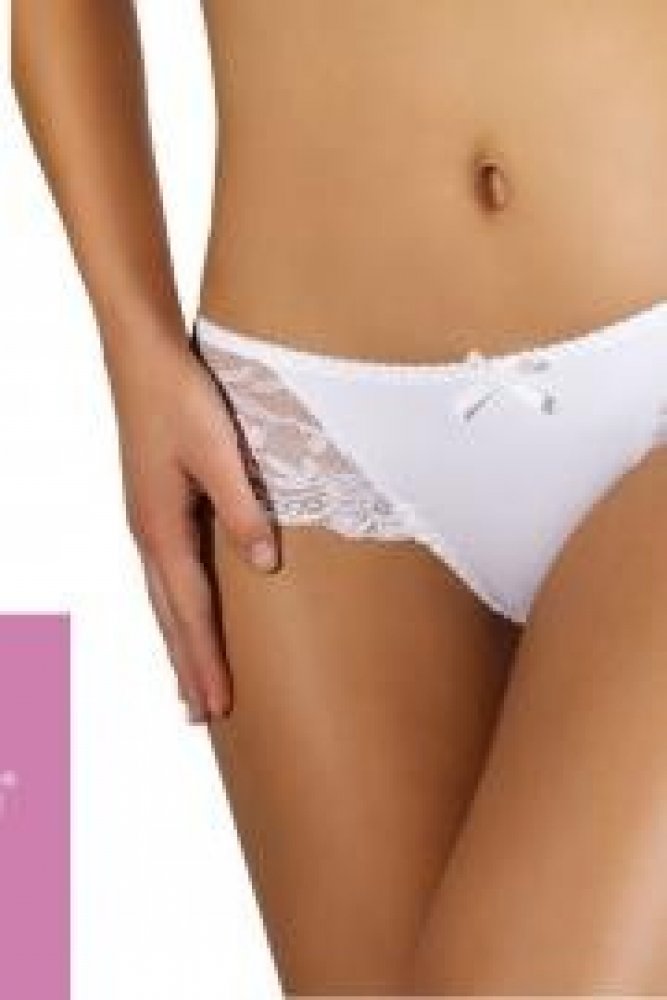 Dámské hladké kalhotky francouzského střihu mají na bocích vsazenou krajku se vzorem velkých květů. Vnitřní část rozkroku kalhotek je podšita bavlněnou látkou.