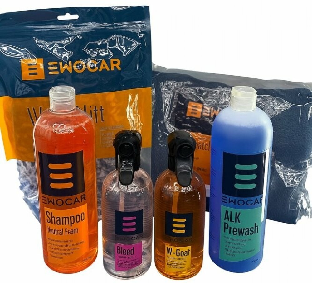 Sada profesionálních autokosmetických produktů Ewocar nabízí kompletní péči o exteriér vozidla. V balení najdete vše potřebné pro důkladné mytí i ochranu laku.