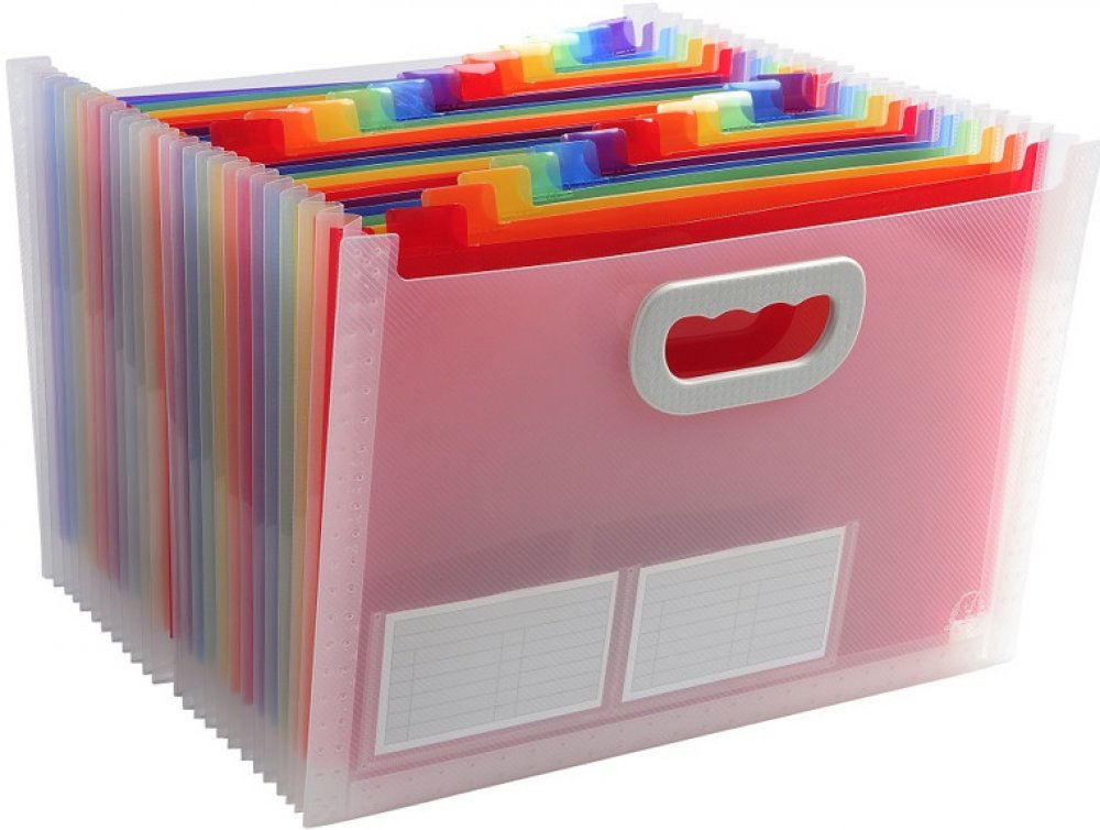 Atraktivní velkoobjemový pořadač vhodný k přehledné evidenci, uchovávání a bezpečnému přenosu dokumentů a drobných předmětů. Vnitřek rozdělen barevnými záložkami na samostatné sekce. Pořadač je opatřen pevnými rukojeťmi pro snadné přenášení. Kombinovatelné s dalšími výrobky řady Crystal. rozměry: 330 x 235 x 250 mm. Materiál: čirý PP, 1 mm, barevný PP, 0,2 mm, 24 vnitřních záložek, předtištěné a popisovatelné samolepicí barevné identifikační štítky, kapacita: 800 listů papíru (80 g), snadná údržba - omyvatelné balení: 1 ks.