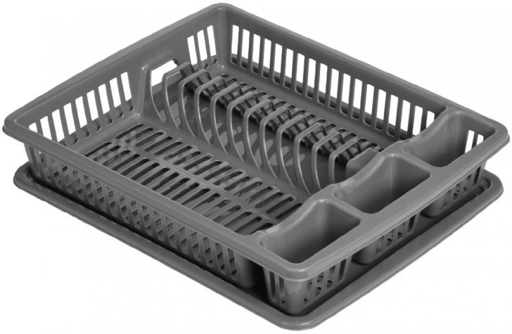 Udržujte pořádek ve své kuchyni s tímto zásobníkem na sušení nádobí. Velký obdélníkový odkapávač na nádobí vyrobený z odolného plastu, doplněný odkapávací miskou a odtokovými otvory, které poskytují dostatek prostoru pro uspořádání talířů, misek, hrnků, sklenic, náčiní a příborů.Barva: šedáRozměry: délka: 47 cm x šířka: 37,5 cm x výška: 2 cmMateriál: plast