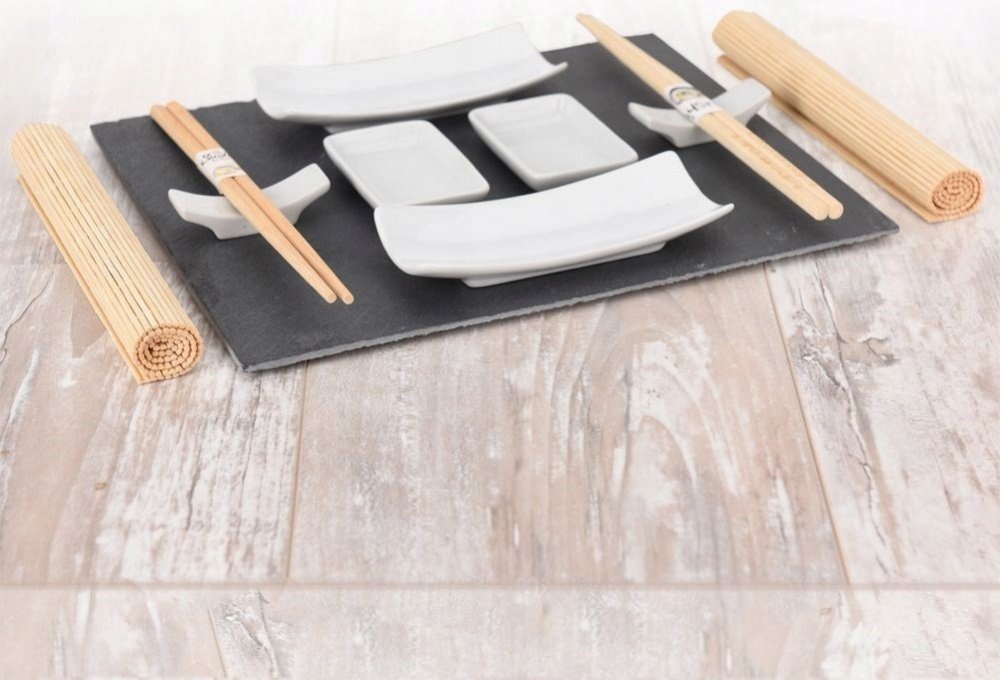 - břidlicová servírovací deska, nádoby z bílého porcelánu a bambusové hůlky i prostírání