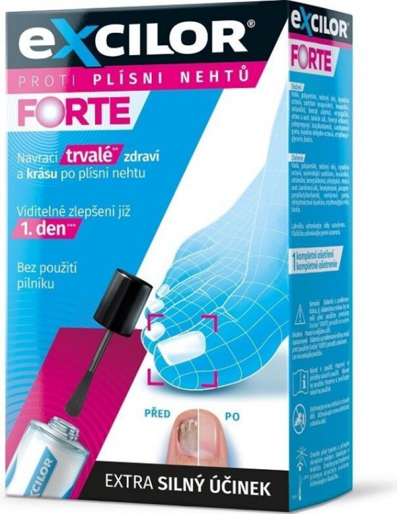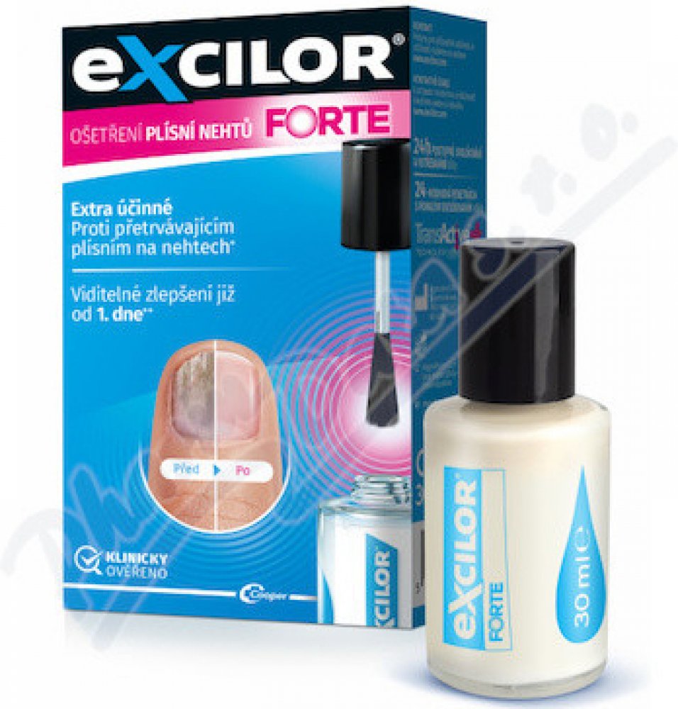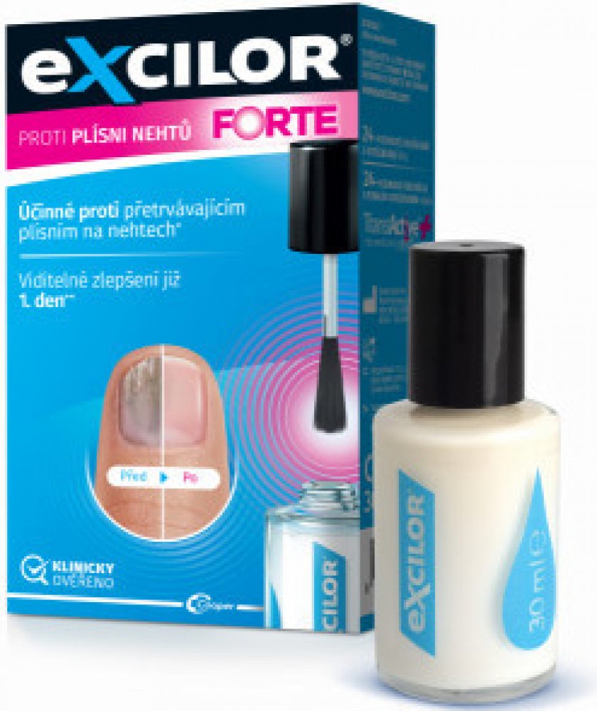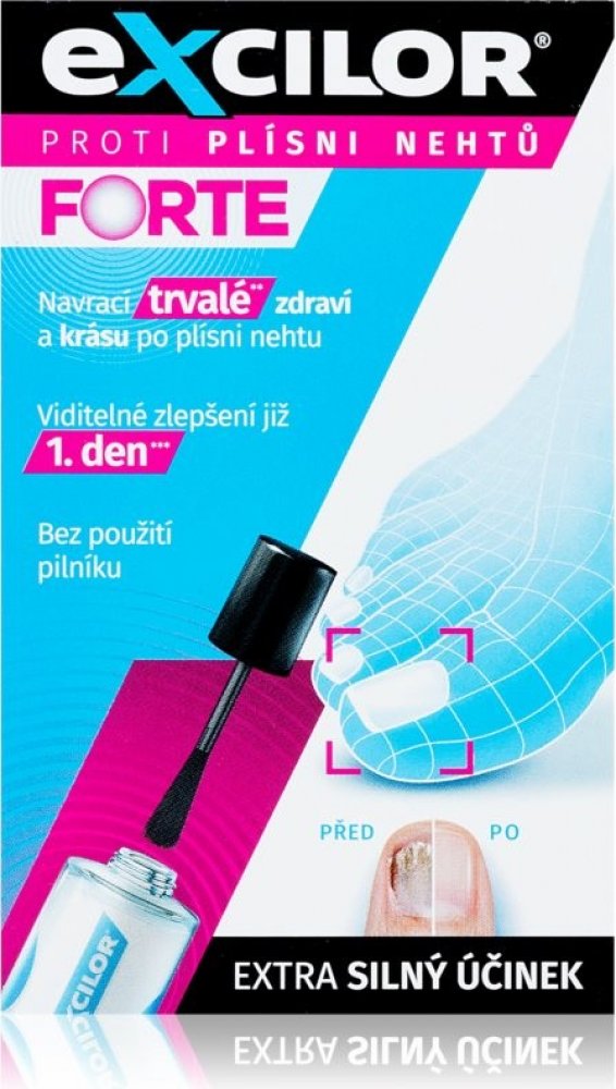 Excilor FORTE je účinné řešení proti plísňové infekci nehtů. Rychle proniká nehtem a působí tak v místě problému. Účinné složení nevytváří rezistence, lze ho používat opakovaně a je obohaceno o nehtové lipidy a biotin. Stačí 1 minuta denně bez pilování.