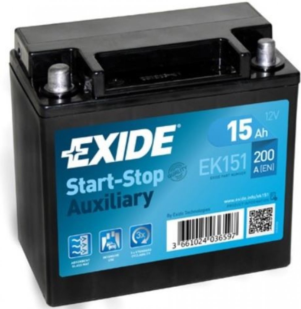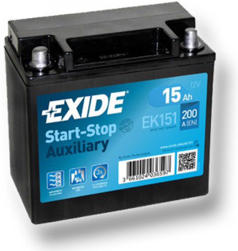 Autobaterie Exide Start-Stop AGM, 12V, 15Ah, 200A, EK151Exide uvádí na trh náhradní spotřeby svou řadu přídavních akumulátorů, které byly vyvinuty na základě zkušeností získaných při našem vývoji originálních autodílů. Přídavné akumulátory napájejí elektrické spotřebiče u některých vozů, jako doplněk hlavní startovací baterie.Výhody: 3krát delší cyklická životnost. Dlouhá skladovatelnost. VRLA (regulace ventilem) pro bezpečnost vůči únikům. Může být instalována v prostoru pro posádku. Zhmotněné zkušenosti z dodávek pro prvovýrobu.