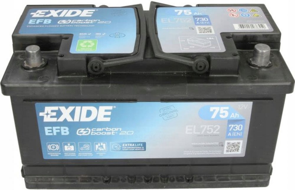 Autobaterie Exide EFB (Enhanced Flooded Battery), model EL752, jsou konstruovány tak, aby odolaly nárokům moderních vozidel se systémy Start-Stop. Jejich vylepšená konstrukce zahrnuje silnější desky a speciální polyesterovou mikrovláknitou vrstvu (scrim) na povrchu kladných desek. Tato vrstva pomáhá udržet aktivní materiál na svém místě i při hlubším vybíjení a častém cyklování, čímž výrazně zvyšuje životnost baterie. Technologie EFB také umožňuje lepší a rychlejší přijímání nabíjecího proudu, což je klíčové pro efektivní dobíjení, zejména při jízdách na krátké vzdálenosti nebo u vozidel s rekuperací brzdné energie.