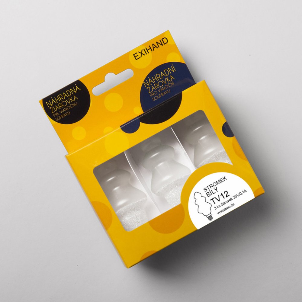 Blistr 3 žárovek Stromek bílý 20V/0,1A – náhradní žárovky do vánočního řetězuHledáte kvalitní náhradní žárovky pro svůj vánoční řetěz? Blistr 3 žárovek Stromek bílý 20V/0,1A od českého výrobce EXIHAND nabízí tradiční skleněné žárovky v ikonickém tvaru stromečku. Každá žárovka je ručně vyrobená, čímž získává originální vzhled a vysokou kvalitu zpracování. Díky teplé bílé barvě světla navodí ve vašem interiéru útulnou sváteční atmosféru.Technické parametry Počet žárovek v balení: 3 ks (blistr) Napětí: 20 V Proud: 0,1 A Příkon: 3x0,1 A Typ zdroje: Vláknová žárovka Barva světla: Teplá bílá Patice: E10 Stmívatelné: Ano Rozměry žárovky: 6,57 × 2,47 cm Výrobce: EXIHAND Určení: Náhradní žárovky do vánočního řetězu Minimální životnost: 500 hodinVhodné využití a inspiraceTyto vláknové žárovky představují ideální řešení pro opravu a údržbu tradičních vánočních řetězů s paticí E10. Stylové provedení ve tvaru stromečku je nejen funkční, ale také esteticky dotváří výsledný vzhled dekorace. Díky možnosti stmívání můžete snadno přizpůsobit intenzitu světla vaší aktuální náladě nebo potřebám.Doporučení pro uživatelePři výměně žárovek vždy vypněte řetěz ze sítě a dodržujte napětí i proud doporučený výrobcem. Žárovky jsou vhodné pouze pro použití ve svítidlech s odpovídajícím napětím 20 V a závitem E10.Trust badges & garance Životnost: Minimálně 500 hodin Výroba: Ruční práce – tradiční česká kvalitaFAQ Lze žárovky stmívat? Ano, žárovky jsou stmívatelné a umožňují nastavit intenzitu světla dle vašich preferencí. Jsou žárovky univerzální? Jsou určeny pro vánoční řetězy s napětím 20 V a paticí E10. Před nákupem ověřte kompatibilitu s vaším řetězem.Zvolte náhradní žárovky EXIHAND pro dlouhou životnost, tradiční vzhled a pohodovou vánoční atmosféru!