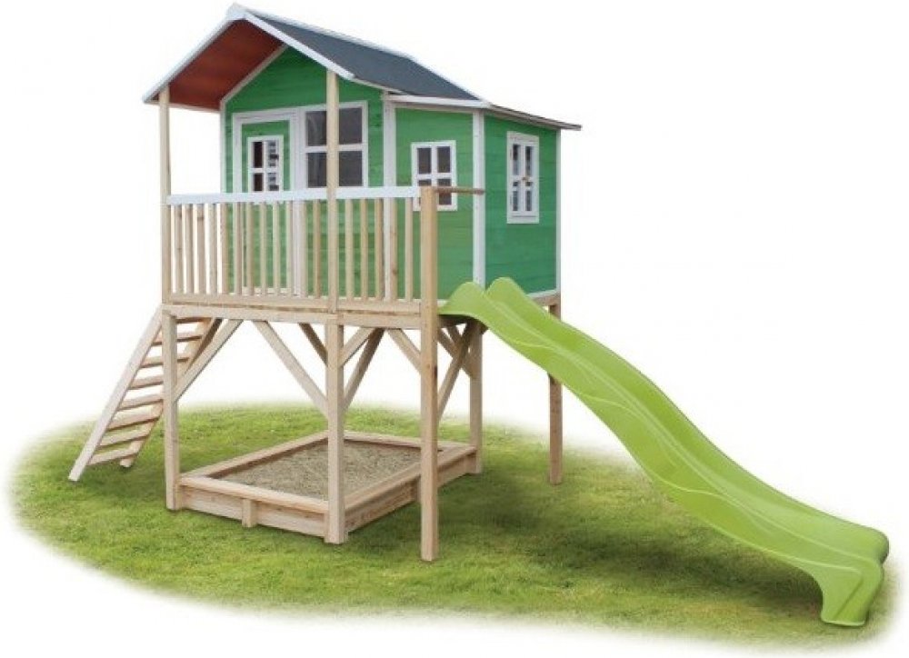 Vlastní domeček na hraní by chtělo každé dítě. Nějaké super místo na hraní společně se svými sourozenci, nebo kamarády? EXIT Loft 750 je právě takový domeček pro mladé i staré ! Domeček Loft 750 má hlavní výhodu, že má podestu ve výšce 120cm což umožňuje že si děti mohou jednoduše hrát pod domečkem v pískovišti. Domeček je rozšířen o půlmetru což, zajistí větší prostor uvnitř. A protože střecha je vodotěsná, je vevnitř vždy sucho. Domeček na stojnách má opravdovou verandu a velkou skluzavkou o délce 2,4m. Ti nejmladší si mohou hrát dole na pískovišti, zatímco ti starší si hrají nahoře v domečku. S veselými plexisklovými okny je tento nápaditý dětský domeček snem pro každé dítě.Domečky jsou ze suchého cedrového dřeva. Je to zvláštní dřevina, protože již od přírody odolává povětrnostním vlivům, vlhkosti a také trouchnivění. Cedrové dřevo není ošetřeno nezdravými chemikáliemi, jako je to často u např. borovicového nebo smrkového dřeva. Domečky odpovídají aktualním bezpečnostním požadavkům (EN-71), a tak je zajištěno bezpečné potěšení ze hry. Domečky jsou sestaveny z předmontovaných stavebních prvků, dokonce i okna a dveře jsou předmontovaná. Stavební prvky jsou pro Vás již předvrtané, a tak je domeček možné v mžiku sestavit. Domečky se montojí dle podrobných návodů. Součástí jsou šrouby a veškeré doplňky potřebné k montáži.Montáž je velmi jednoduchá, protože domeček je montovaný s velkých sesazených dílů, střecha, bočnice, podlaha a pod.. Domečky nádherně voní, i dlouho po montáži na zahradě. Cedrové dřevo je vysoce kvalitní voňavé dřevo s velkou tolerancí k výkyvům teplot. Umístěte na suché, rovné místo, aby dřevo nehnilo a domeček mohl rovně stát. Dodáváno bez písku. Boční přístavek můžete nainstalovat na pravou, nebo levou stranu domečku, tak jak Vám to vyhovuje. To samé se skluzavkou, může být umístěna na pravou stranu, nebo na levou, či před domeček.