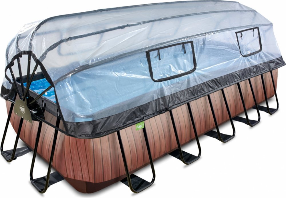 Bazén EXIT Wood Pool 540 x 250 x 122 cm je obdélníkový rámový bazén s krytem. Tento velký bazén s dřevěným vzhledem je standardně vybaven filtračním čerpadlem Sand a bazénovým žebříkem, který umožňuje bezpečný vstup a výstup z bazénu. Rámový bazén nabízí dostatek prostoru, abyste se mohli vyřádit na nafukovací matraci. Chcete se raději potápět? Bazén EXIT Wood je hluboký 122 centimetrů, takže se v něm můžete skutečně ponořit pod vodu. Rámové bazény s krytem z EXIT Toys jsou multifunkční, odolné a představují ideální řešení pro nestabilní letní počasí! Osvěžující koupání ve vašem bazénu! Bazén Wood Pool má na boční stěně modern výrazný vzor dřeva, díky němuž na zahradě upoutá pozornost. Bazén EXIT má silné třívrstvé stěny z PVC a polyesteru a vnitřní strana bazénu je modrá, abyste měli pocit svěžího bazénu. Bazén je vhodný až pro devět osob, a protože je hluboký, můžete si v něm zaplavat i v plaveckých drahách a ponořit se. Tento bazén doplňuje dodávaný systém cirkulace vody. Vysoce kvalitní filtrační čerpadlo Sand čistí bazén od nejmenších částic tím, že čerpá vodu přes filtrační vrstvu. Tím je zajištěno, že nečistoty, jako jsou Sand , brouci nebo řasy, skončí ve filtru. Multifunkční kryt bazénu Se zakrytím bazénu EXIT již nejste závislí na předpovědi počasí. Kryt zajišťuje, že se do vody nedostanou žádné nečistoty, a je také udržitelným řešením pro ohřev vody, protože sluneční teplo se udržuje pod krytem. Kryt je průhledný a díky integrované plynové pružině se velmi snadno otevírá. Kryt má také tři sklápěcí okna a dveře. Stručně řečeno: užijte si bazén za každého počasí. Stabilní a silný! Rámový bazén je nejen jedinečný, ale také stabilní a pevný. Černý ocelový rám bazénu je mimořádně silný o průměru 50 mm a nohy rámu zajišťují optimální stabilitu, takže bazén vždy pevně stojí. Samozřejmě se myslelo i na odolnost: černý rám je pozinkovaný a opatřený práškovou barvou, takže rez nemá šanci. Duplexní nátěrový systém je to, co nazýváme na EXIT Toys . Je čas na osvěžující koupel ve vlastním bazénu EXIT na zahradě! Podrobnosti o produktu: Rozměry (délka x šířka x výška): 540 x 250 x 122 cm Hmotnost: 190 kg Doporučená hloubka vody: 122 cm Objem vody: 13 465 litrů S filtračním čerpadlem Sand a bazénovým žebříkem Největší obdélníkový bazén EXIT Multifunkční kryt bazénu Unikátní Design Pozinkovaný a práškově lakovaný rám Maximální počet osob: 9 Věk: od 6 let Součástí standardní výbavy je: Černý ocelový rám bazénu 540 x 250 x 122 cm. Hnědá vložka s výrazným dřevěným vzorem Kryt se třemi okny a jedněmi dveřmi 585 x 270 cm Včetně filtračního čerpadla Sand (filtrační materiál není součástí dodávky) Žebřík je součástí dodávky Sada na opravu vložky je součástí dodávky Pokyny pro rámový bazén Obal návodu Pokyny pro čerpadlo Pokyn žebřík