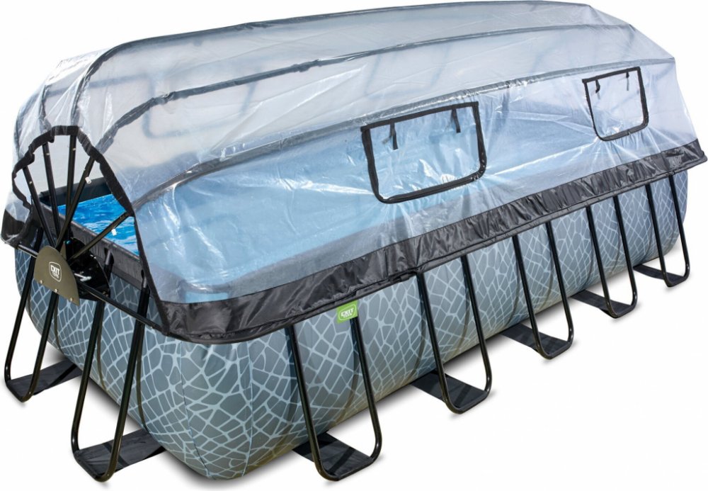 Bazén EXIT Stone Pool 540 x 250 x 122 cm je obdélníkový bazén s šedým rámem. Tento velký bazén je standardně vybaven čerpadlem s pískovou filtrací a bazénovým žebříkem, po kterém můžete bezpečně vstoupit do bazénu a vystoupit z něj. Rámový bazén nabízí dostatek prostoru pro cákání na nafukovací matraci. Chcete se raději potápět? Kamenný bazén EXIT je hluboký 122 centimetrů, takže se můžete skutečně potápět pod vodou. Kamenný bazén má na boční stěně moderní a výrazný kamenný vzor, díky němuž je na zahradě opravdovým lákadlem. Bazén EXIT má silné třívrstvé stěny z PVC a polyesteru a vnitřní strana bazénu je modrá pro svěží pocit z bazénu. Bazén je vhodný až pro devět osob, a protože je hluboký, můžete v něm dokonce plavat kolečka a ponořit se. Tento bazén doplňuje přiložený systém cirkulace vody. Vysoce kvalitní čerpadlo s pískovou filtrací čistí bazén od nejmenších částic tím, že přečerpává vodu přes filtrační lože. Tím je zajištěno, že nečistoty, jako je písek, škůdci nebo řasy, skončí ve filtru. S krytem bazénu EXIT již nejste závislí na předpovědi počasí. Kryt zajišťuje, že se nečistoty již nedostanou do vody, a je také udržitelným řešením pro ohřev vody, protože teplo ze slunce se udržuje pod krytem. Kryt je průhledný a díky integrované plynové tlakové pružině se velmi snadno otevírá. Kryt má také tři sklápěcí okénka a dvířka. Rámový bazén je nejen jedinečný, ale také stabilní a pevný. Černý ocelový rám bazénu je mimořádně silný o průměru 50 mm a nohy rámu zajišťují optimální stabilitu, takže bazén vždy stojí pevně. Samozřejmě bylo pamatováno i na odolnost: černý rám je pozinkovaný a opatřený práškovou barvou, která zabraňuje korozi.
